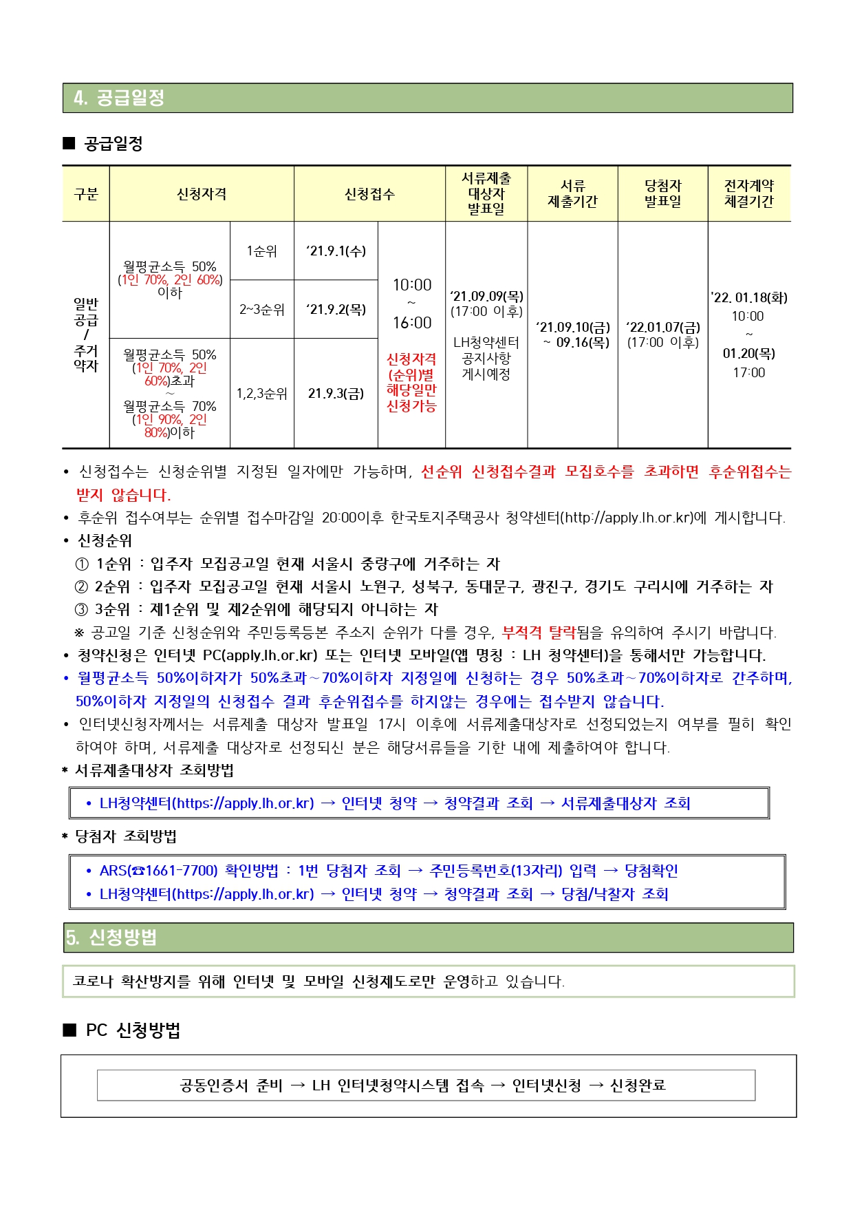▪ 월평균소득 50%이하자가 50%초과∼70%이하자 지정일에 신청하는 경우 50%초과∼70%이하자로 간주하며, 50%이하자 지정일의 신청접수 결과 후순위접수를 하지않는 경우에는 접수받지 않습니다.