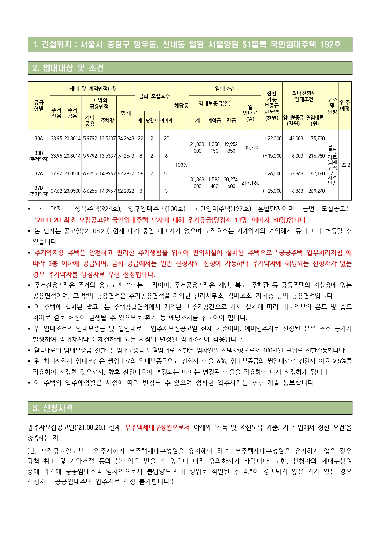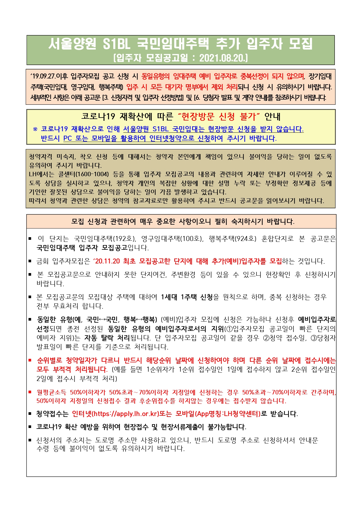 서울 양원 S1BL 국민임대주택 추가 입주자 모집 공고(8.20)