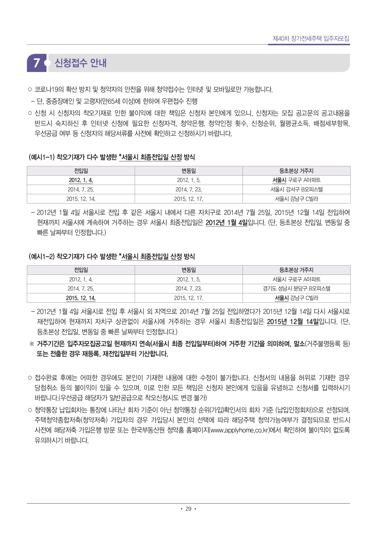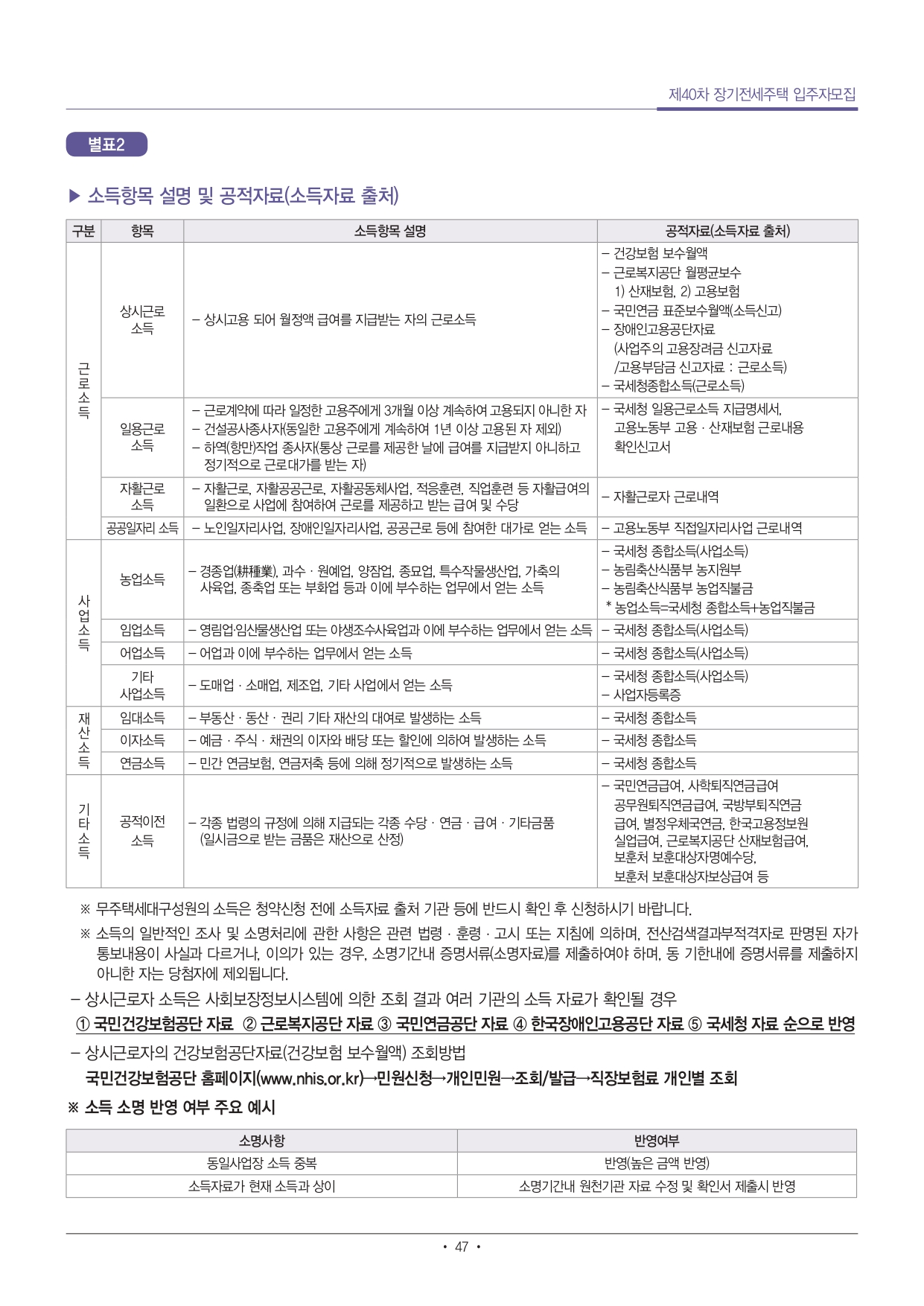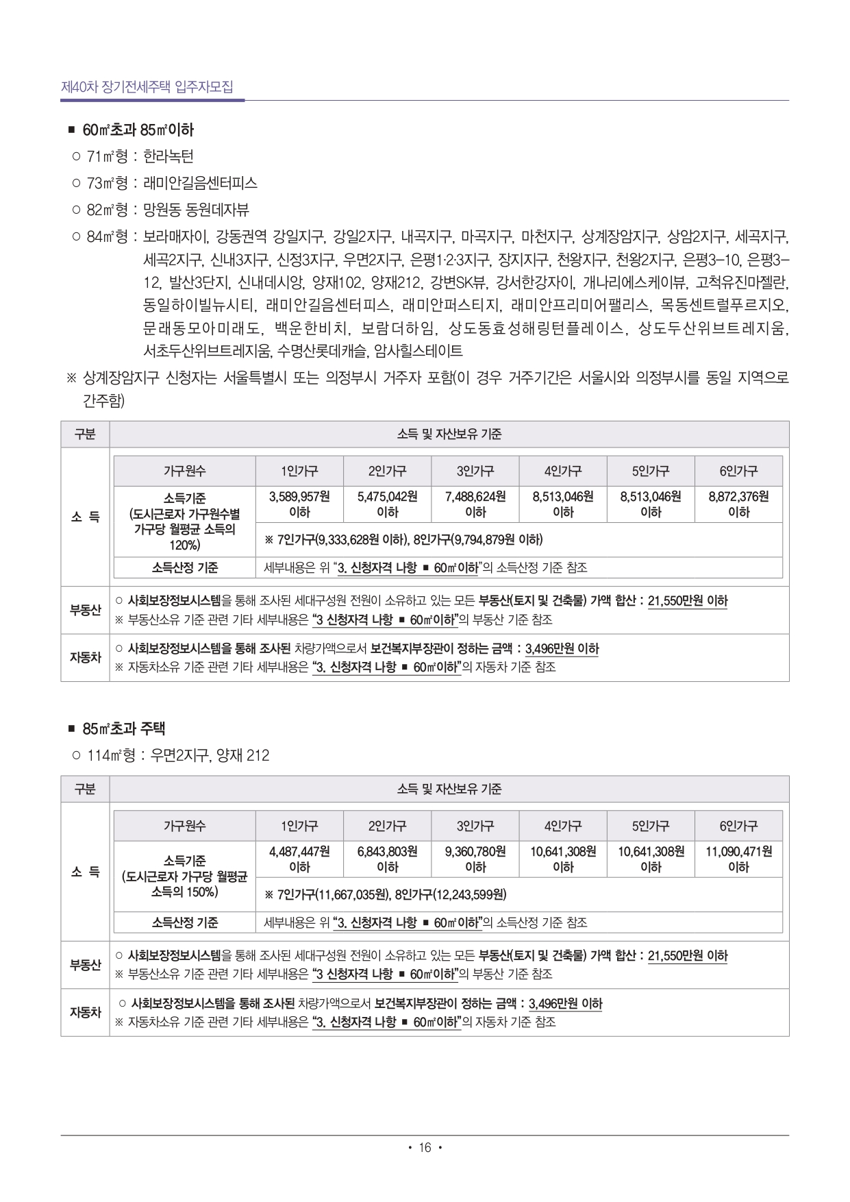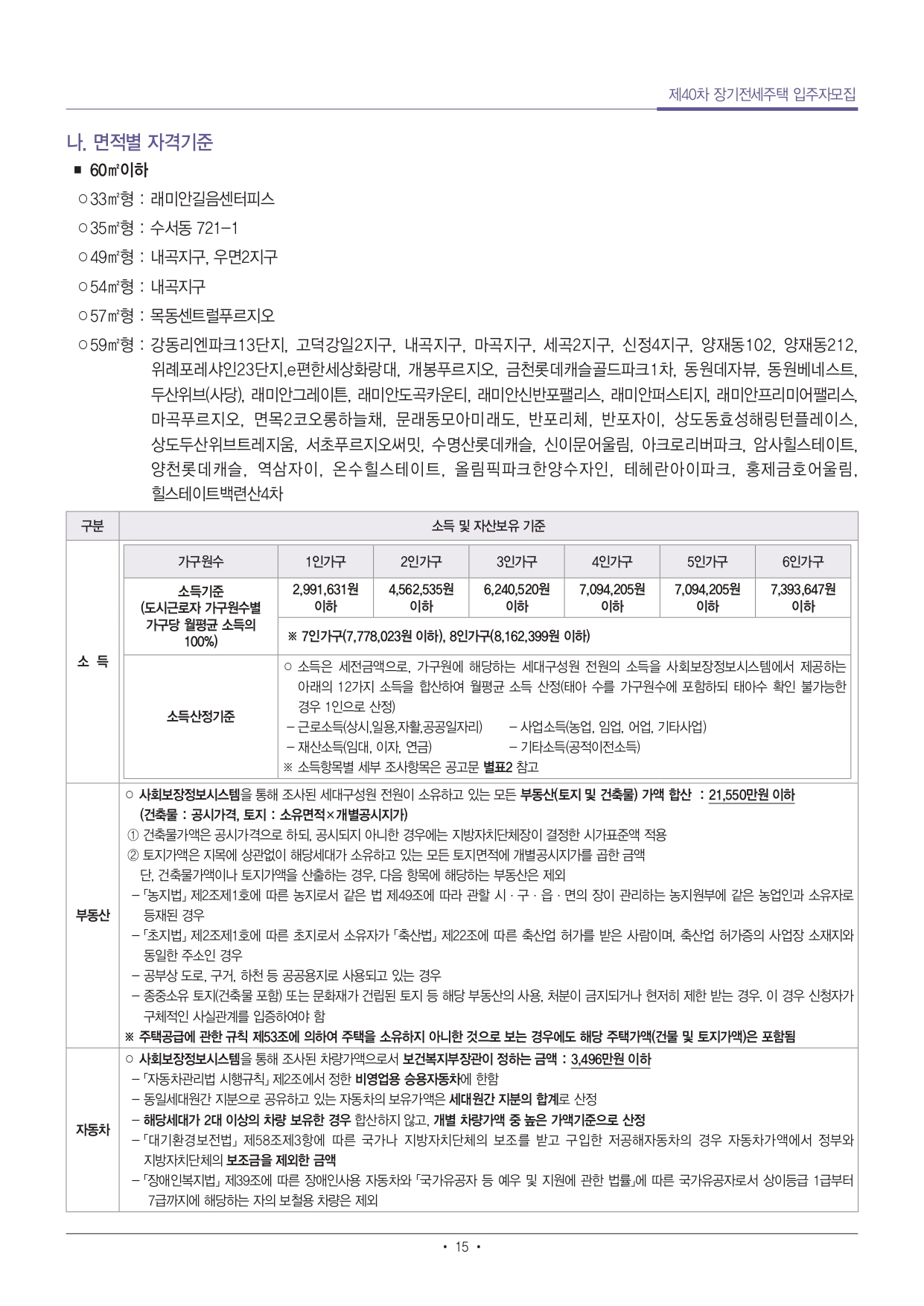 ■ 입주자격 중 주택소유, 소득, 부동산, 자동차 자격기준 산정시점은 입주자 모집공고일로 하되, 사업주체가 입주대상자 확정을 목적으로 사회보장정보시스템을 통해 확인한 입주자격은 입주자 모집공고일에 산정된 것으로 간주합니다. 입주자격 조사결과 부적격사유에 대한 소명의무는 신청자에게 있습니다.