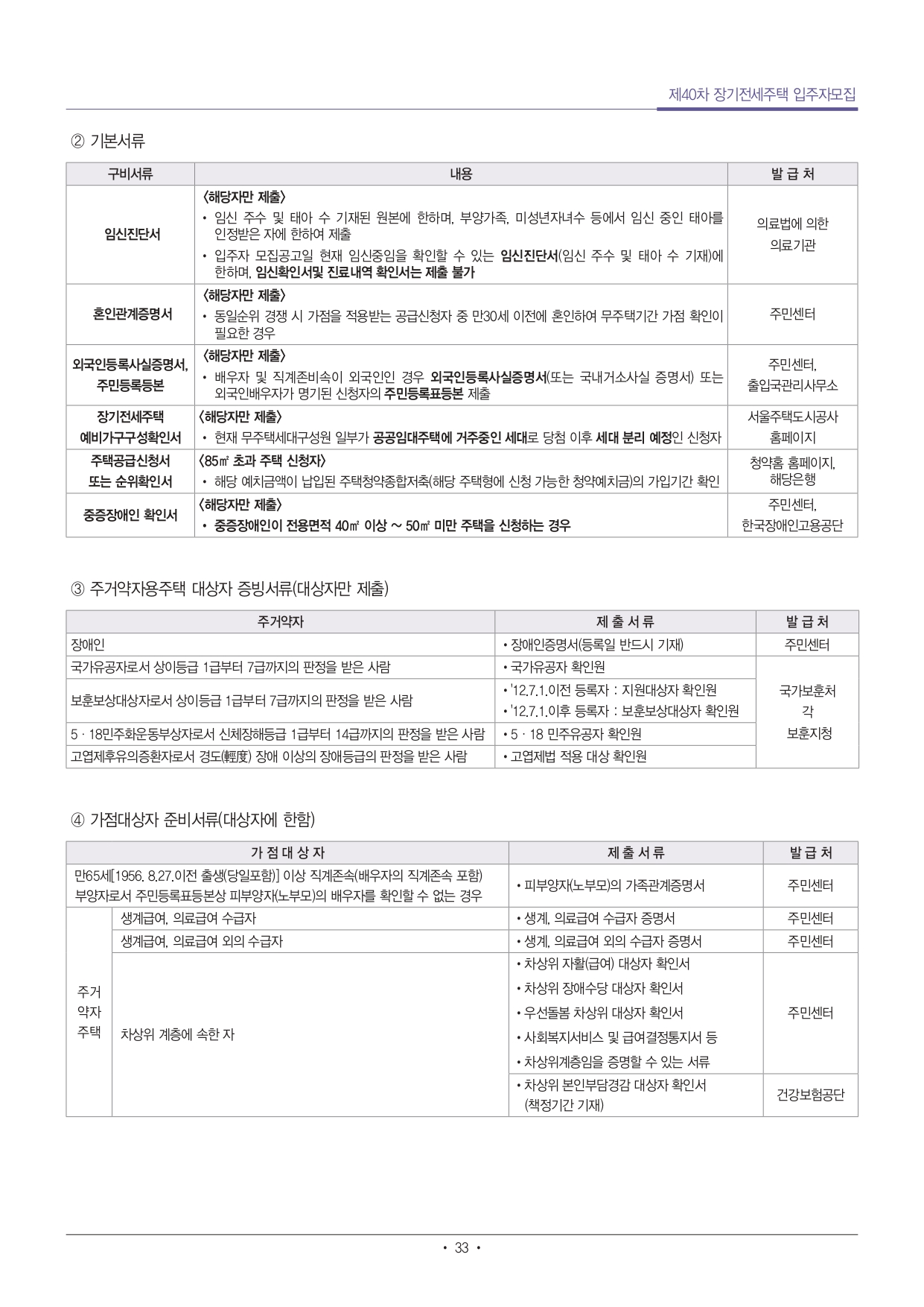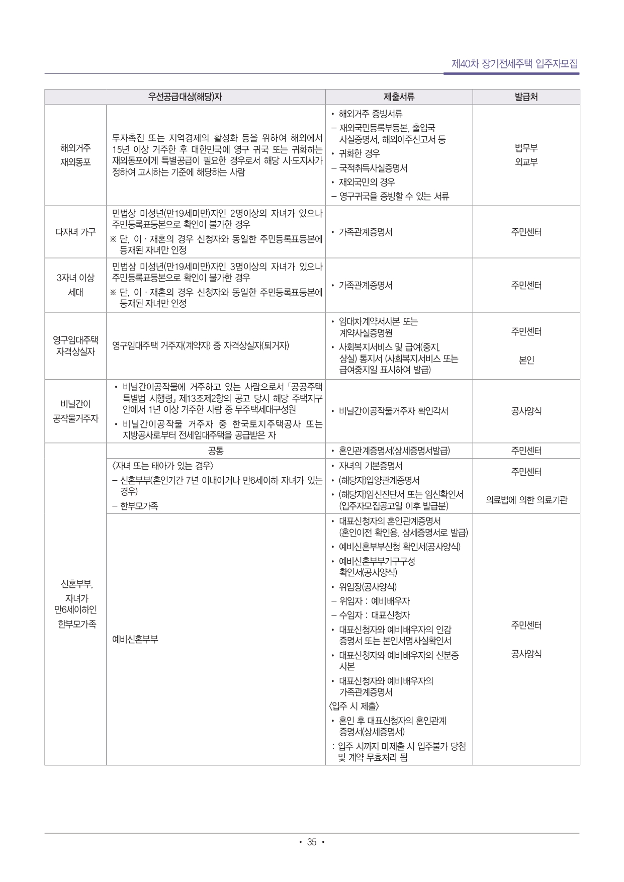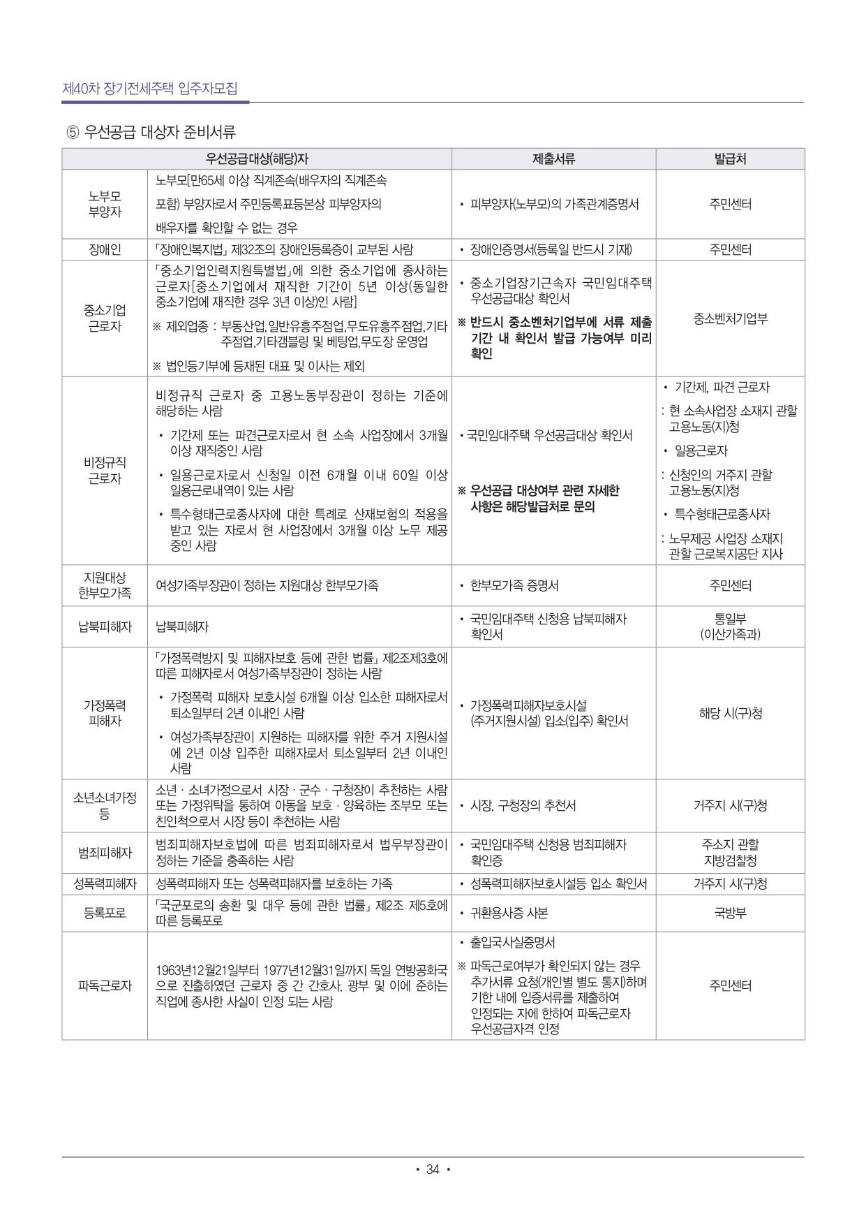 - 단, 「장애인고용촉진 및 직업재활법」에 따른 중증장애인 확인서가 발급 가능한 사람은(「장애인고용촉진 및 직업재활법 시행규칙」 별표1에 따른 중증장애인)은 단독세대주라도 50㎡미만의 주택을 신청할 수 있음