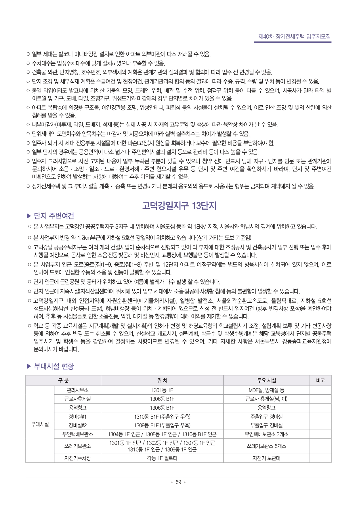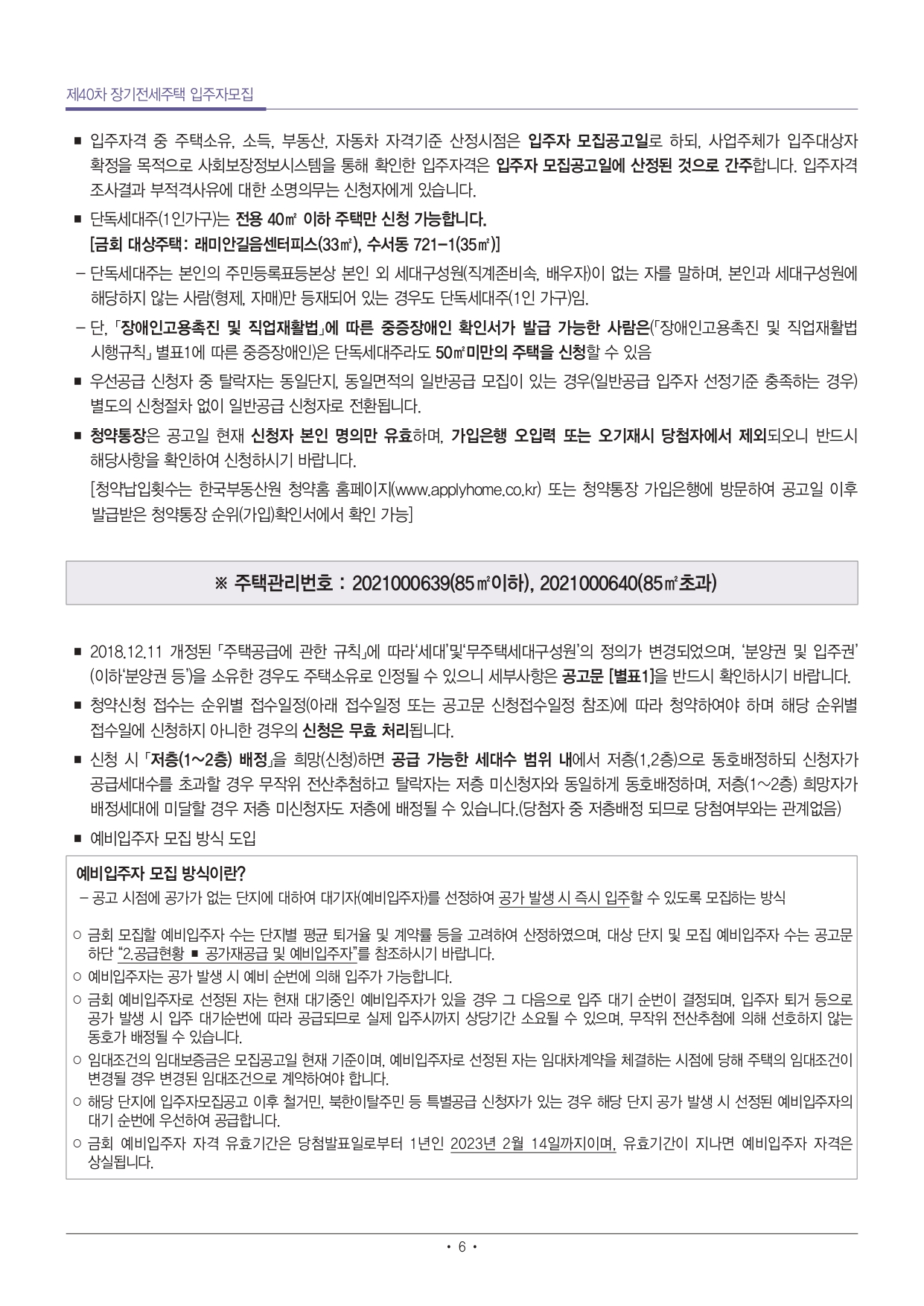 | 예비입주자 모집 방식이란? - 공고 시점에 공가가 없는 단지에 대하여 대기자(예비입주자)를 선정하여 공가 발생 시 즉시 입주할 수 있도록 모집하는 방식 ○ 금회 모집할 예비입주자 수는 단지별 평균 퇴거율 및 계약률 등을 고려하여 산정하였으며, 대상 단지 및 모집 예비입주자 수는 공고문 하단 “2.공급현황 ■ 공가재공급 및 예비입주자”를 참조하시기 바랍니다. ○ 예비입주자는 공가 발생 시 예비 순번에 의해 입주가 가능합니다. ○ 금회 예비입주자로 선정된 자는 현재 대기중인 예비입주자가 있을 경우 그 다음으로 입주 대기 순번이 결정되며, 입주자 퇴거 등으로 공가 발생 시 입주 대기순번에 따라 공급되므로 실제 입주시까지 상당기간 소요될 수 있으며, 무작위 전산추첨에 의해 선호하지 않는 동호가 배정될 수 있습니다. ○ 임대조건의 임대보증금은 모집공고일 현재 기준이며, 예비입주자로 선정된 자는 임대차계약을 체결하는 시점에 당해 주택의 임대조건이 변경될 경우 변경된 임대조건으로 계약하여야 합니다. ○ 해당 단지에 입주자모집공고 이후 철거민, 북한이탈주민 등 특별공급 신청자가 있는 경우 해당 단지 공가 발생 시 선정된 예비입주자의 대기 순번에 우선하여 공급합니다. ○ 금회 예비입주자 자격 유효기간은 당첨발표일로부터 1년인 2023년 2월 14일까지이며, 유효기간이 지나면 예비입주자 자격은 상실됩니다. |