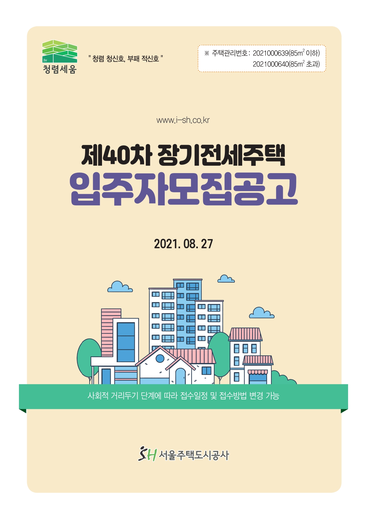 서울주택도시공사의 제40차 장기전세주택 입주자 모집공고입니다. 자세한 내용은 아래 리플릿을 참고하시기 바랍니다.