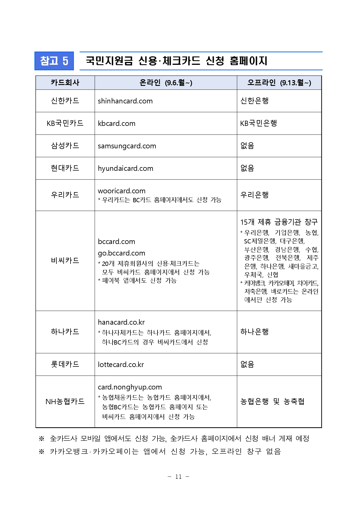 신용ㆍ체크카드 충전을 원하는 국민은 9월 6일(월)부터 본인이 사용하는 카드사의 홈페이지나 앱을 통해 온라인으로 신청할 수 있으며, 9월 13일(월)부터는 카드와 연계된 은행에서 오프라인 신청도 가능합니다.