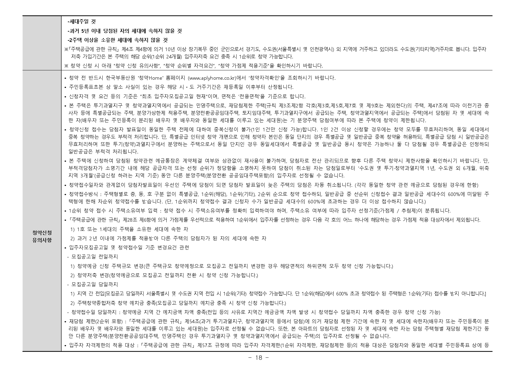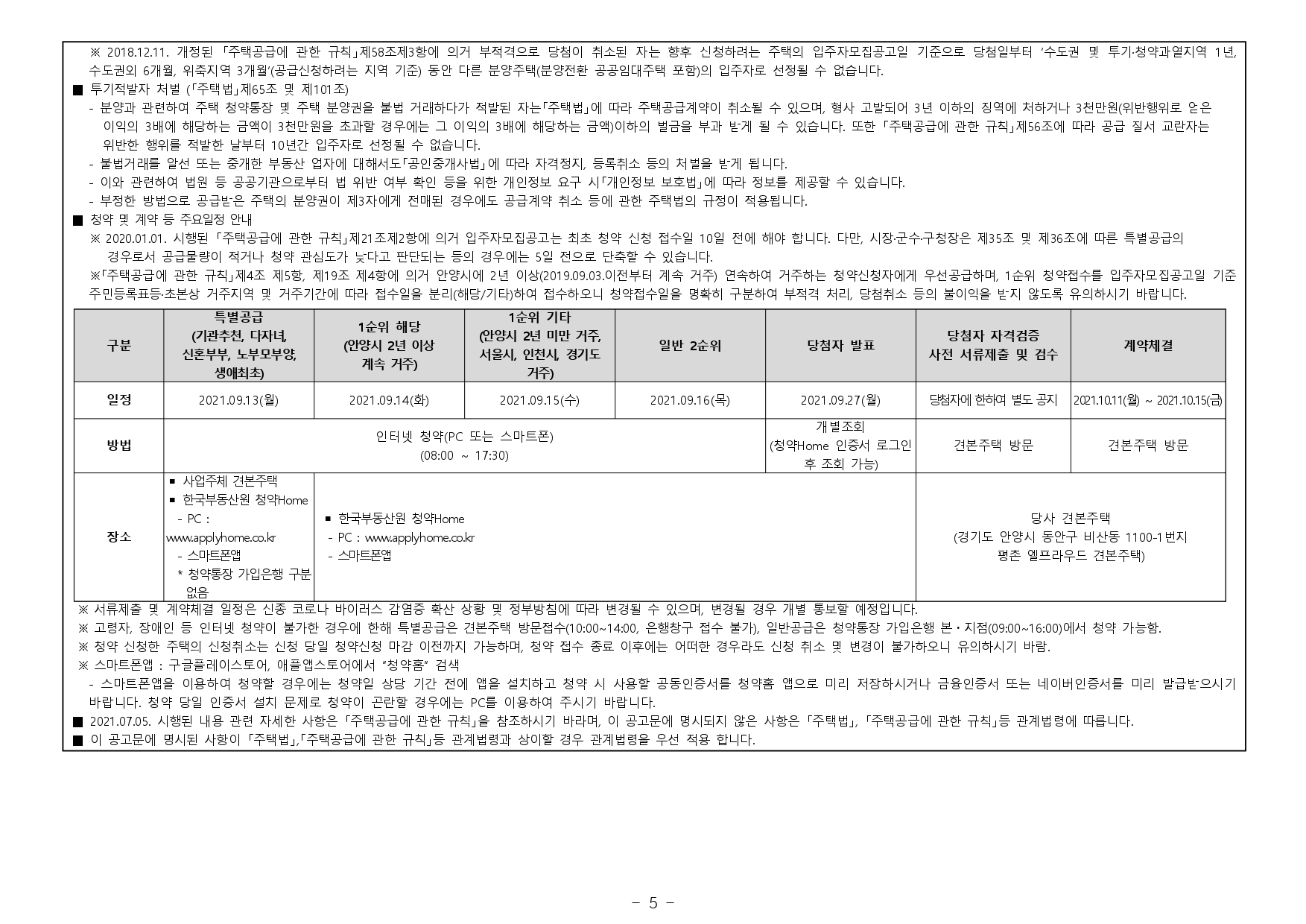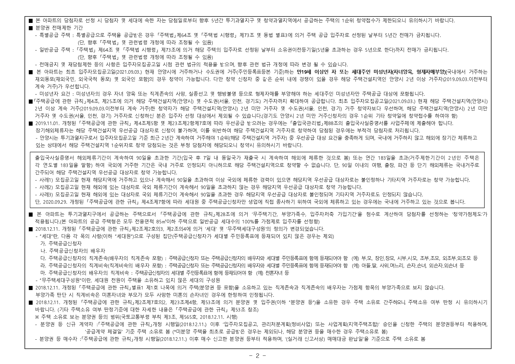 - 전매금지 및 재당첨제한 등의 사항은 입주자모집공고일 시점 관련 법규의 적용을 받으며, 향후 관련 법규 개정에 따라 변경 될 수 있습니다.