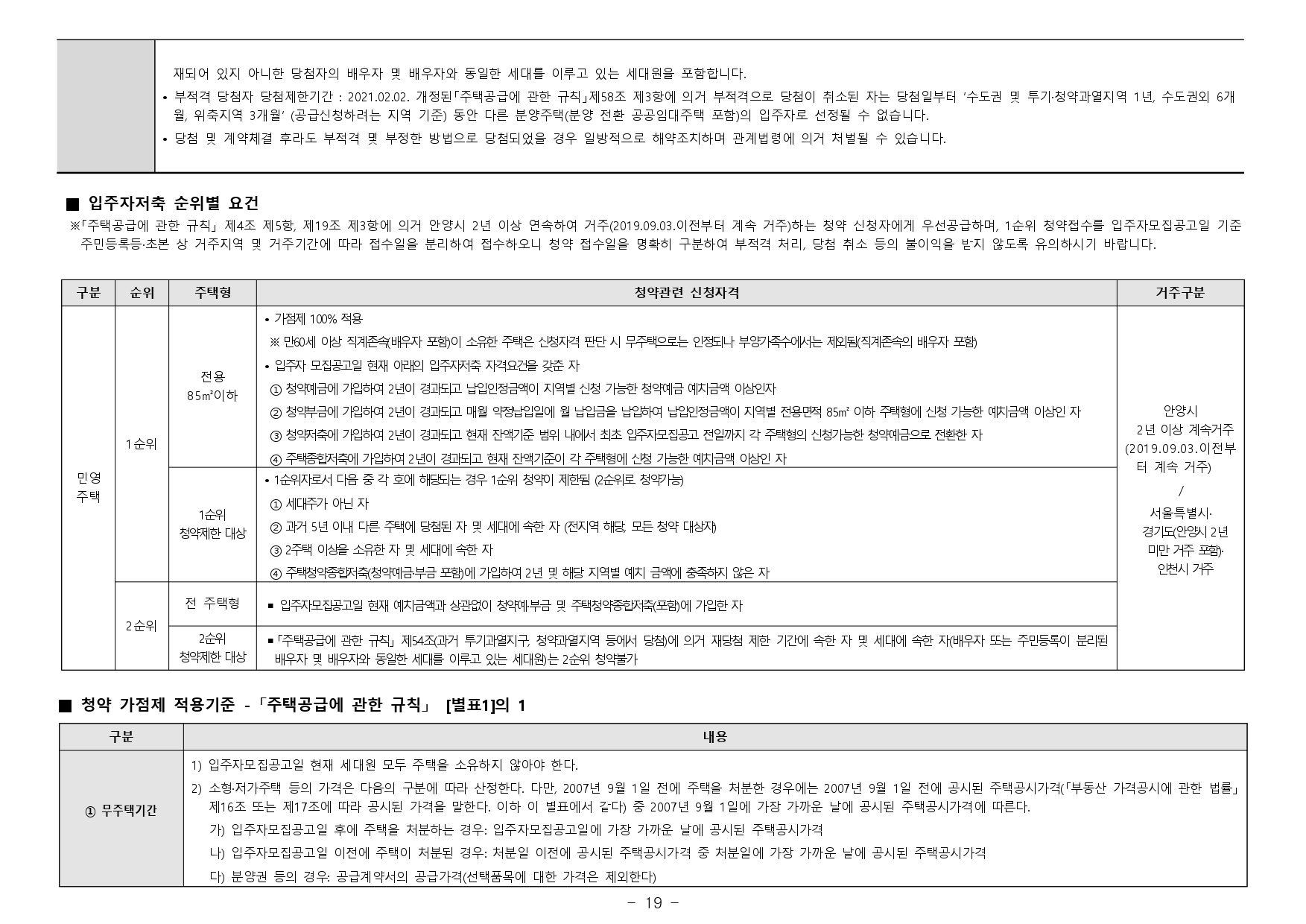 ■ 해당 주택건설지역 안양시는 「주택법」 제63조 및 제63조의2에 의한 투기과열지구 및 청약과열지역으로서, 본 아파트는 「주택공급에 관한 규칙」에 따라 1주택 이상 소유한 세대에 속한 분은 1순위 가점제 청약이 불가하며, 2주택 이상 소유한 세대에 속한 분은 1순위 자격에서 제외됩니다.