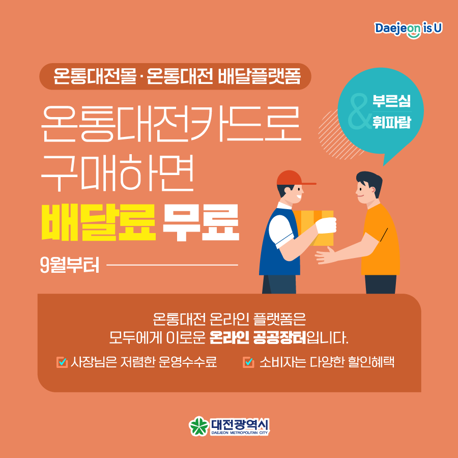 9월부터 온통대전 배달플랫폼에서 온통대전으로 1만원 이상 주문하면 건당 배달료 3000원 지원. 배달플랫폼 ‘부르심’에서 결제하면 3000원 자동할인, ‘휘파람’에서는 3000원 무료쿠폰을 발급 또는 3000원 포인트 정립.