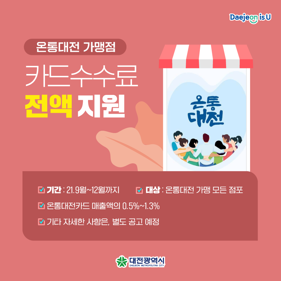 전국이 부러워하는 대전시 지역화폐 온통대전. 대전시는 가맹점주인 소상공인의 부담을 줄여드리기 위해 8월부터 11월분 온통대전 카드수수료를 전액지원. 매출액의 0.5~1.3%. 자세한 사랑은 별도 공고할 예정.