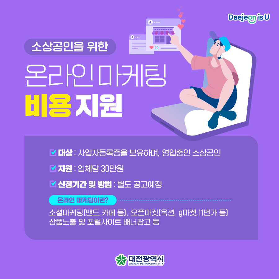 우리지역에서 사업자등록증을 갖고 영엽중이 소상공인의 온라인마케팅을 위한 비용 30만원 지원. 소셜마케팅(밴드, 카페 등), 오픈마켓(옥션, G마켓 ,11번가 등) 상품노출 및 포털사이트 배너광고 등.