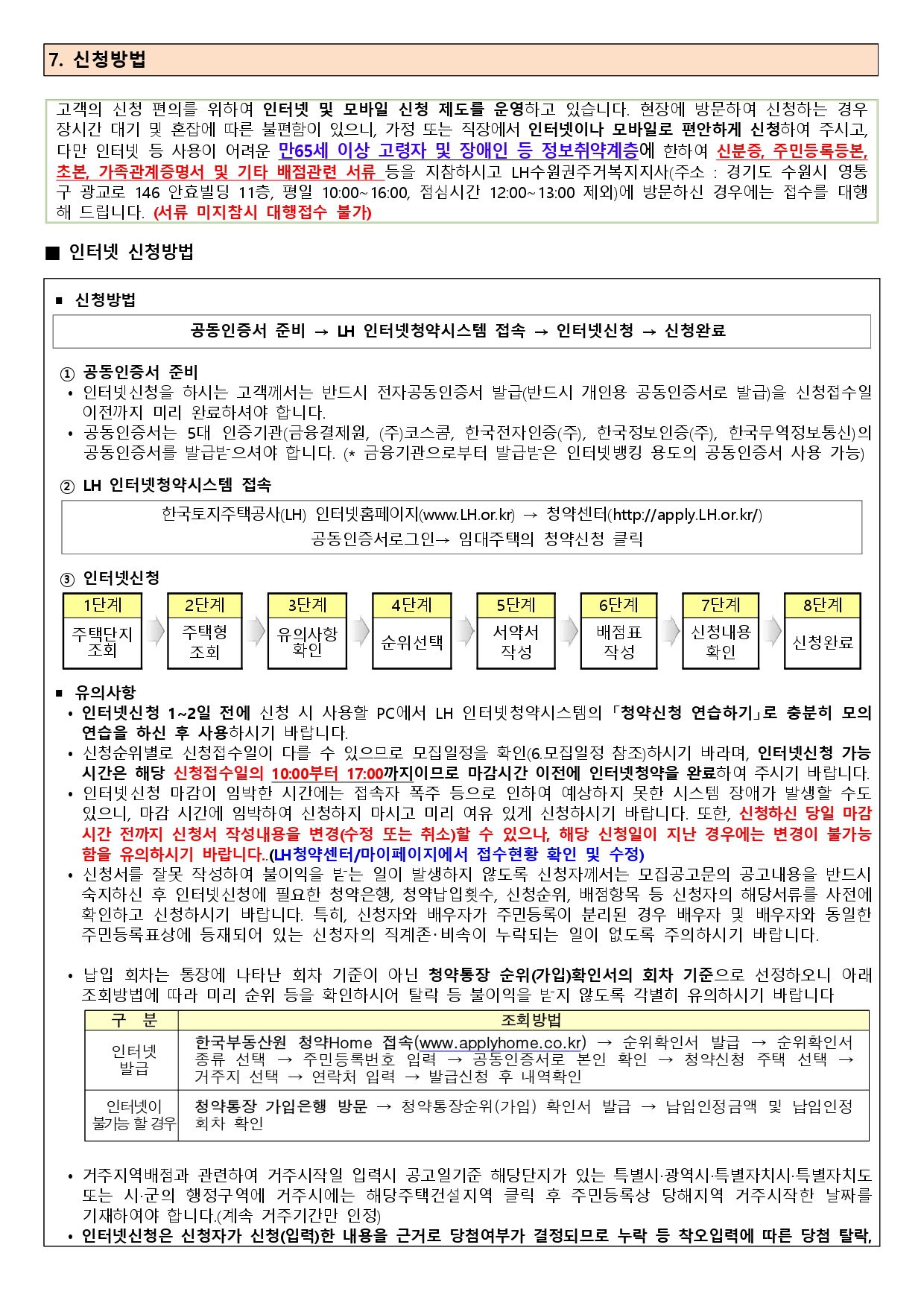 ▪ 고객의 신청 편의를 위하여 인터넷 및 모바일로 청약접수를 받습니다. 장시간 대기와 혼잡에 따른 불편함 으로 인하여 현장접수가 불가하오니, 가정 또는 직장에서 인터넷이나 모바일로 편안하게 신청하여 주시기 바랍니다. (단, 만65세 이상 고령자 및 장애인 등 정보취약계층에 한하여 접수 대행 가능함. 코로나19 바이 러스 감염예방 및 확산방지를 위하여 신청자 1인만 방문 허용. 신분증, 주민등록등본, 초본, 가족관계증명 서, 기타 배점관련서류 등을 필히 지참하여야 하며, 미지참시 접수 불가)