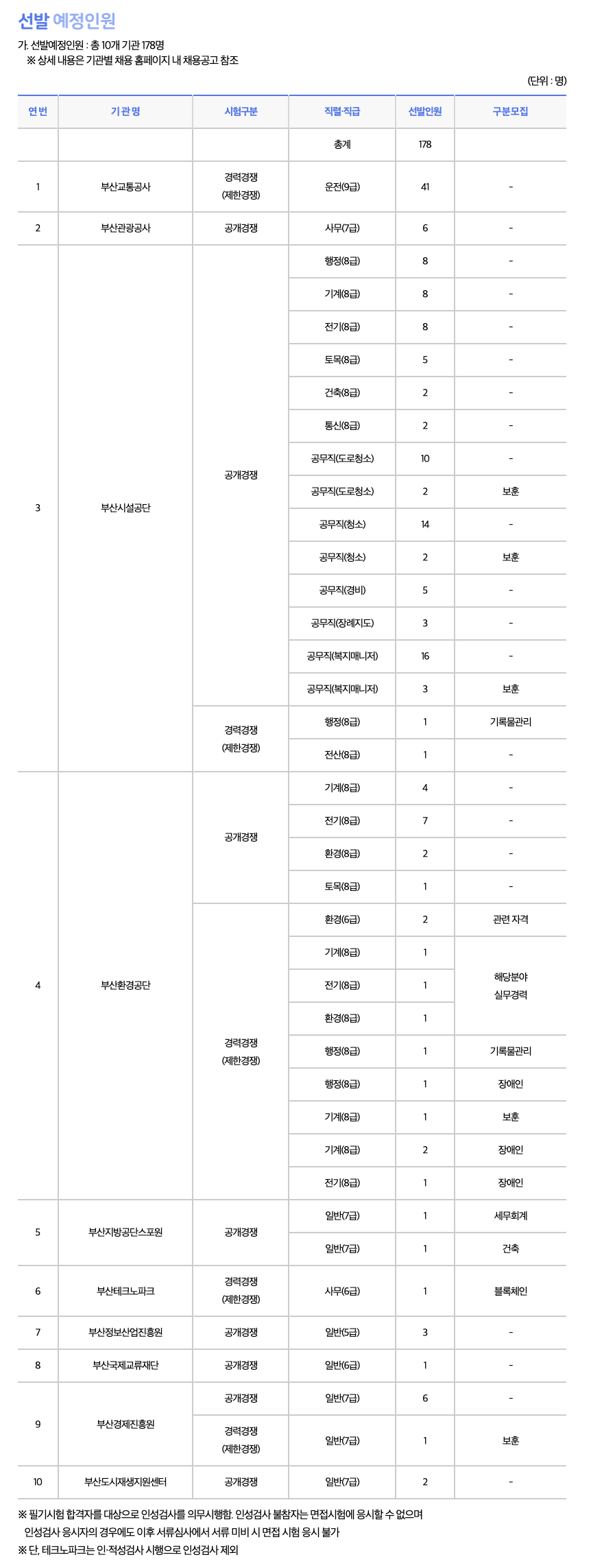 ※ 상세 내용은 기관별 채용 홈페이지 내 채용공고 참조 (단위 : 문항수) 연번 기 관 명 시험(전형)구분 직렬·직급 공통과목(문항수) 전공과목(문항수) 1 부산 교통공사 경력 경쟁 (제한경쟁) 운전