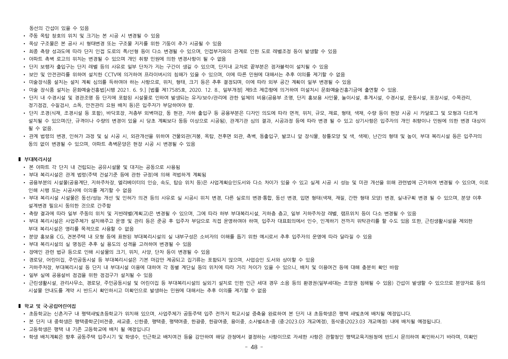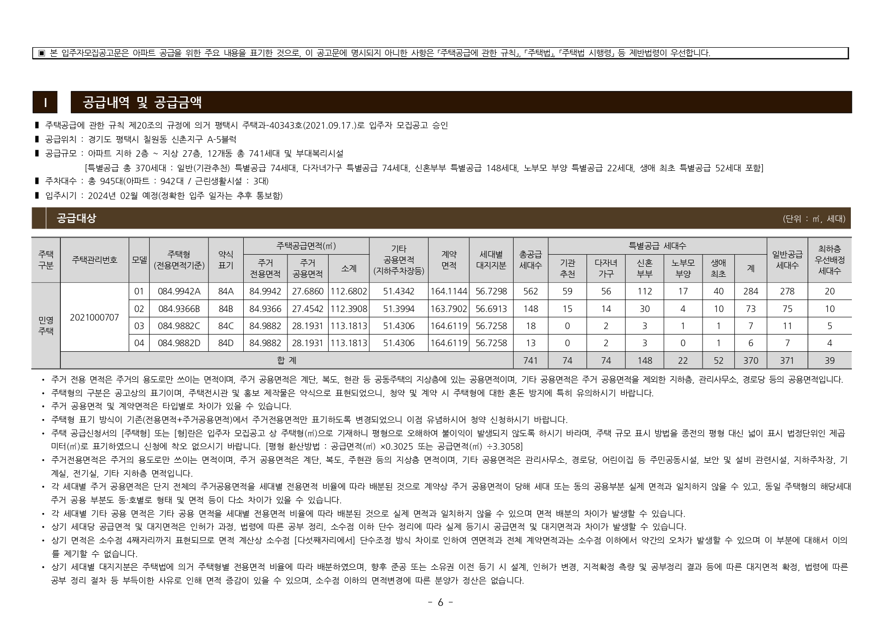 ▣ 본 아파트의 주택건설지역인 평택시는 「수도권정비계획법」 제 6조 제1항에 의한 성장관리권역이며, 「주택법」 제63조 관련 비투기과열지구 및 「주택법」 제63조의2에 의한 청약 과열지역으로서 대출제한(LTV, DTI 등), 청약 제한, 전매 제한 등이 적용되는 민영아파트입니다.