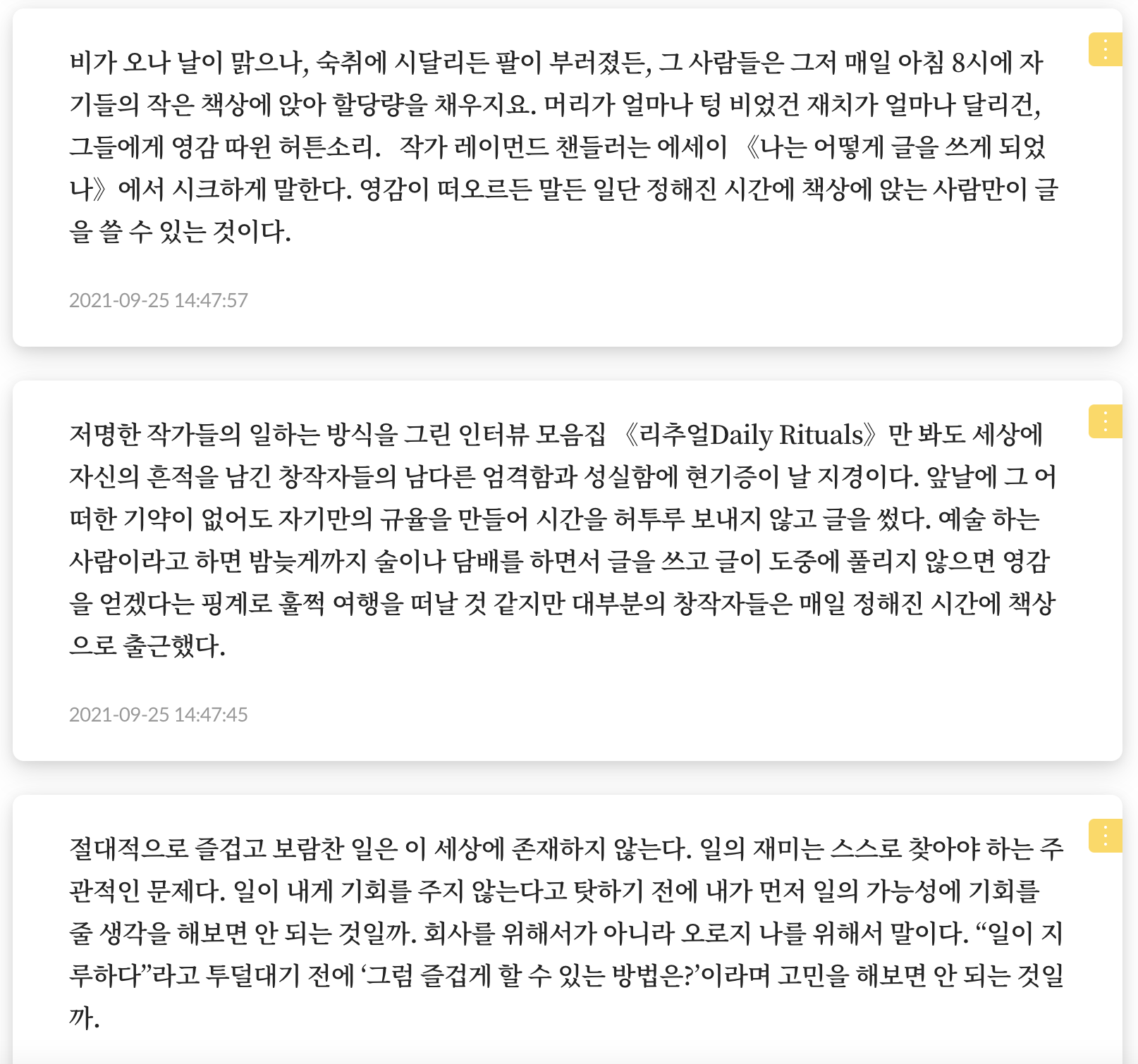 임경선 작가의 책<태도에 관하여> 밑줄. 밀리의 서재 독서노트 활용. 직장인으로서 글을 깨작깨작 쓰고 있는 사람으로서 공감이 가는 구절이 많았다.
