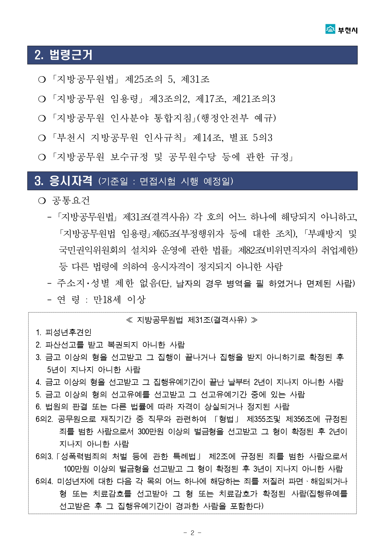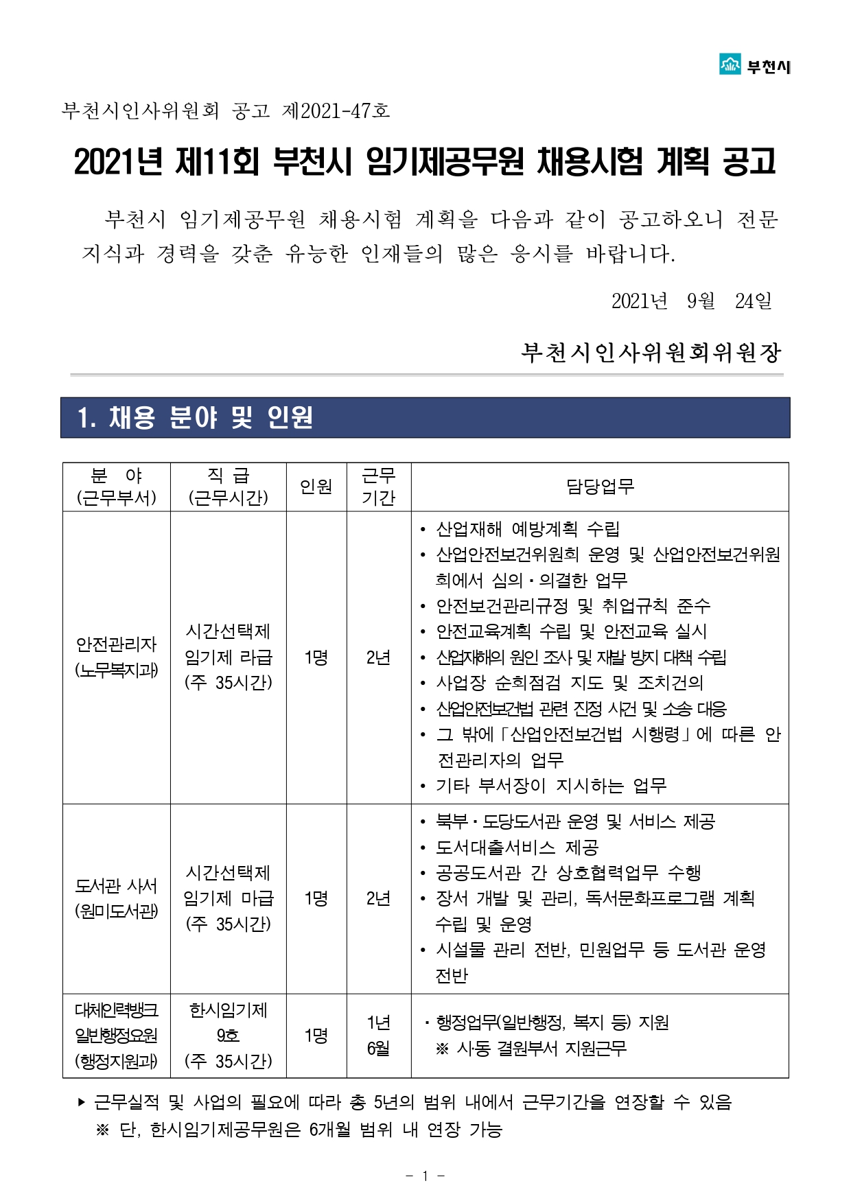 2021년 제11회 부천시 임기제공무원 채용시험 계획공고(2021.9.24)