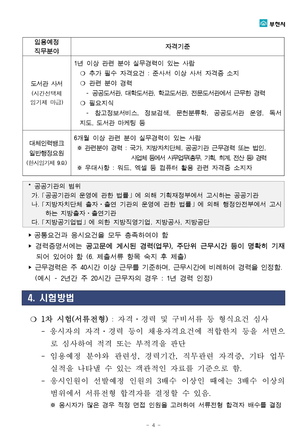 부천시 임기제공무원 채용시험 계획을 다음과 같이 공고하오니 전문 지식과 경력을 갖춘 유능한 인재들의 많은 응시를 바랍니다.