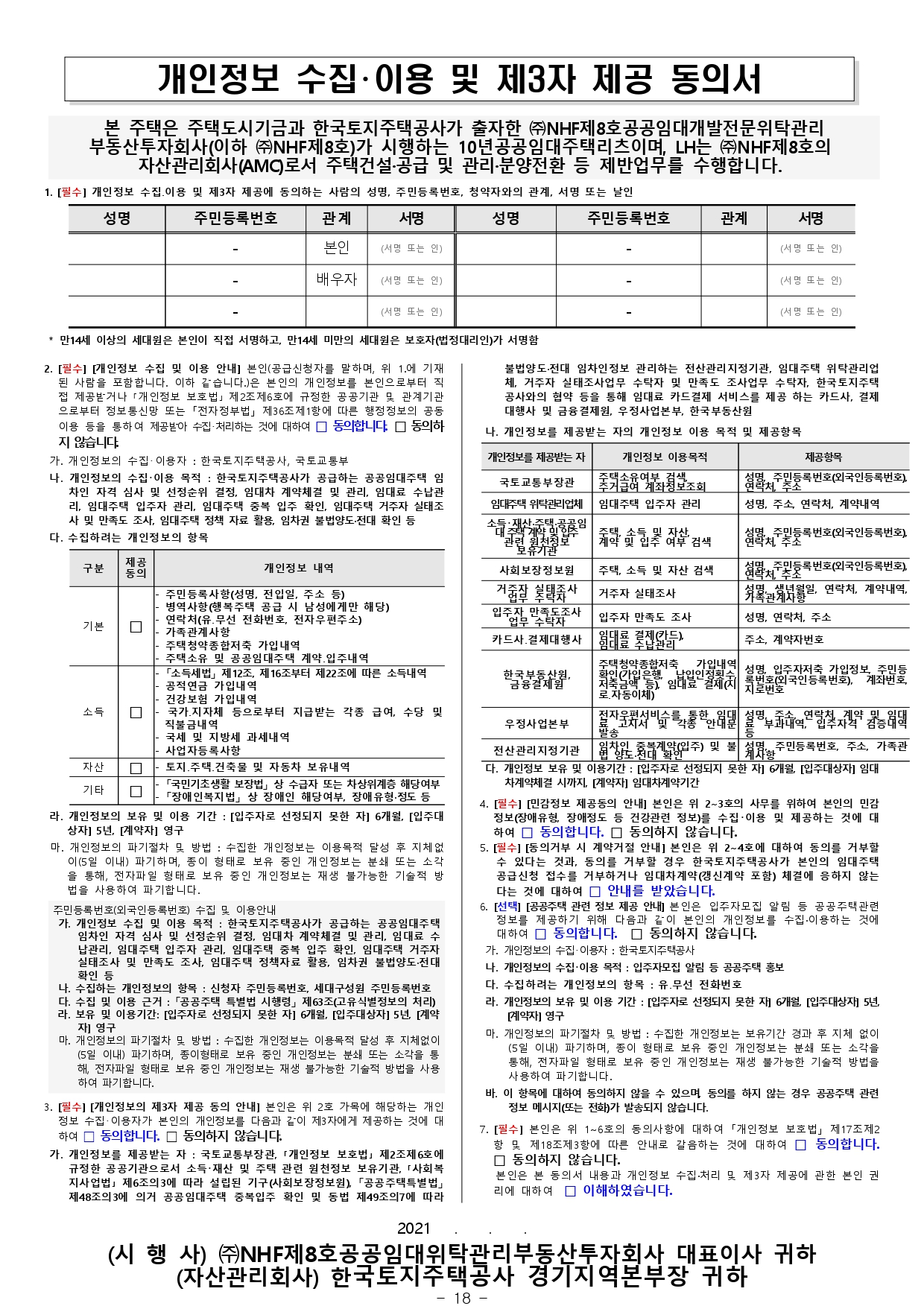 • 금회 공급하는 주택 중 군포송정 A-2BL은 주택도시기금과 LH가 출자한 ㈜NHF제8호공공임대개발전문위탁관리부동산투자회사(이하 ㈜NHF제8호)가 사업시행하는 10년공공임대주택리츠이며, LH는 리츠의 자산관리회사(AMC)로서 주택건설․공급 및 관리․분양전환 등 제반업무를 수행합니다.