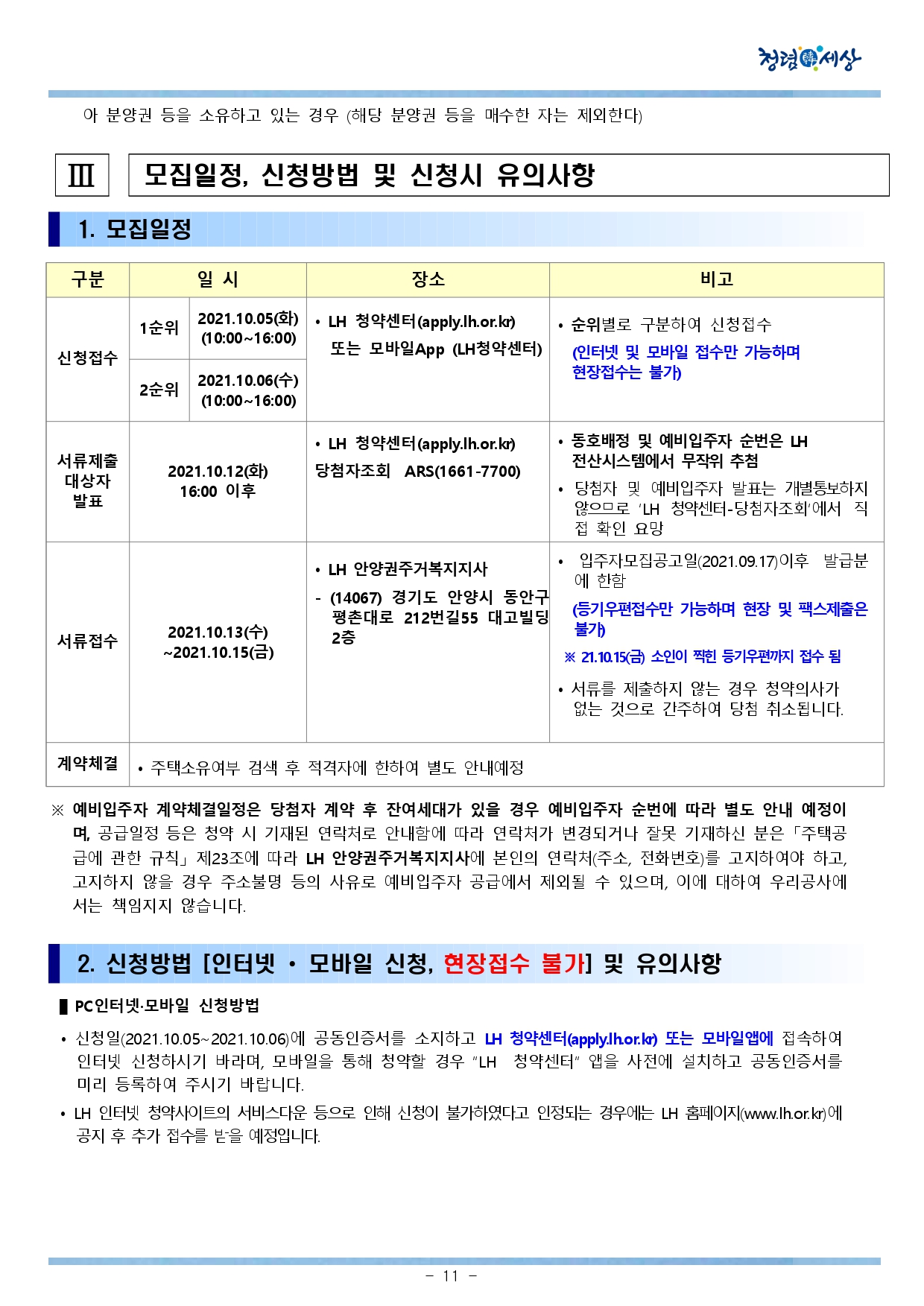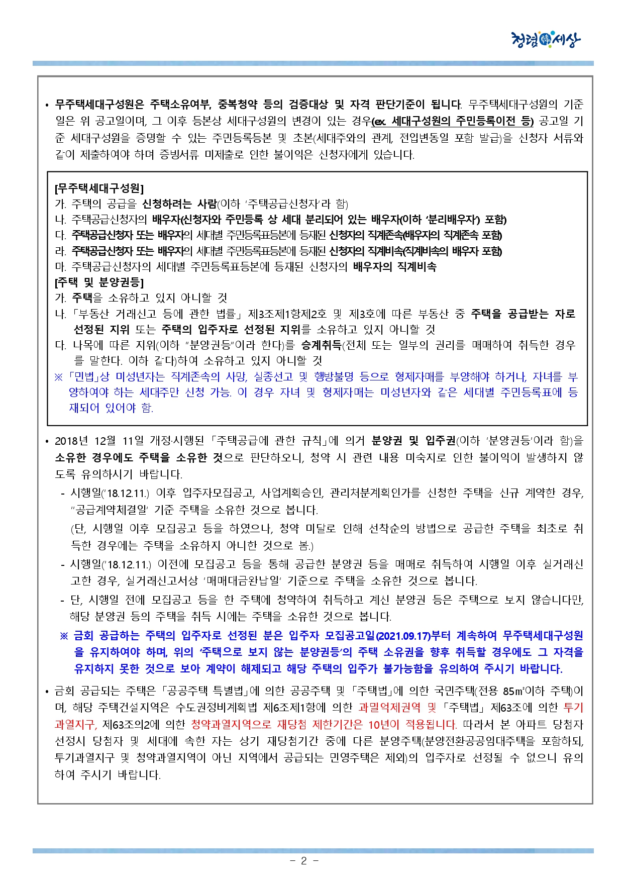 • 금회 공급하는 주택의 예비입주자모집공고일은 2021.09.17(금)이며, 이는 청약자격(청약신청, 나이, 세대구성원, 주택소유여부 등)의 판단기준일입니다.
