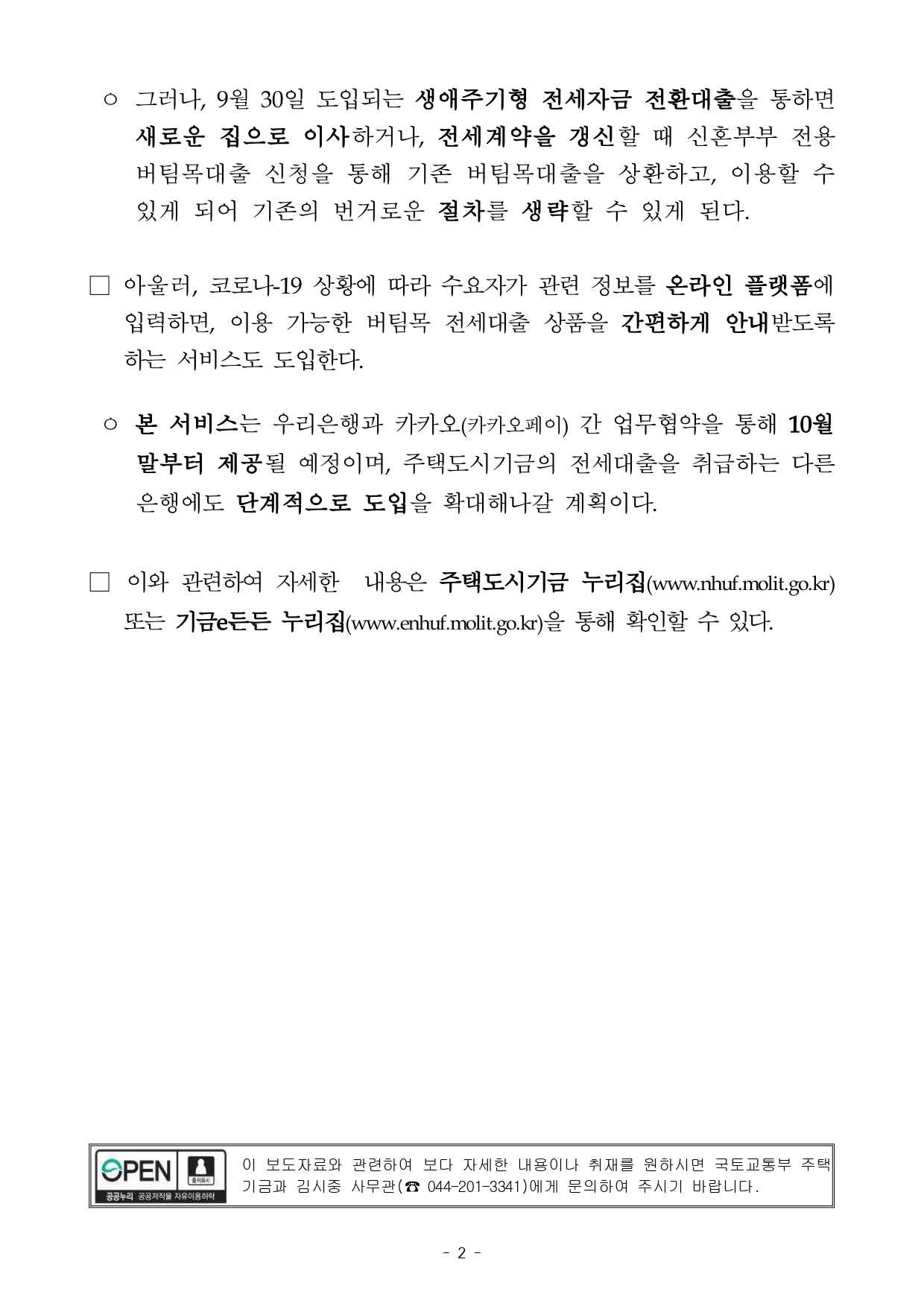 본 서비스는 우리은행과 카카오(카카오페이) 간 업무협약을 통해 10월 말부터 제공될 예정이며, 주택도시기금의 전세대출을 취급하는 다른 은행에도 단계적으로 도입을 확대해나갈 계획이다.