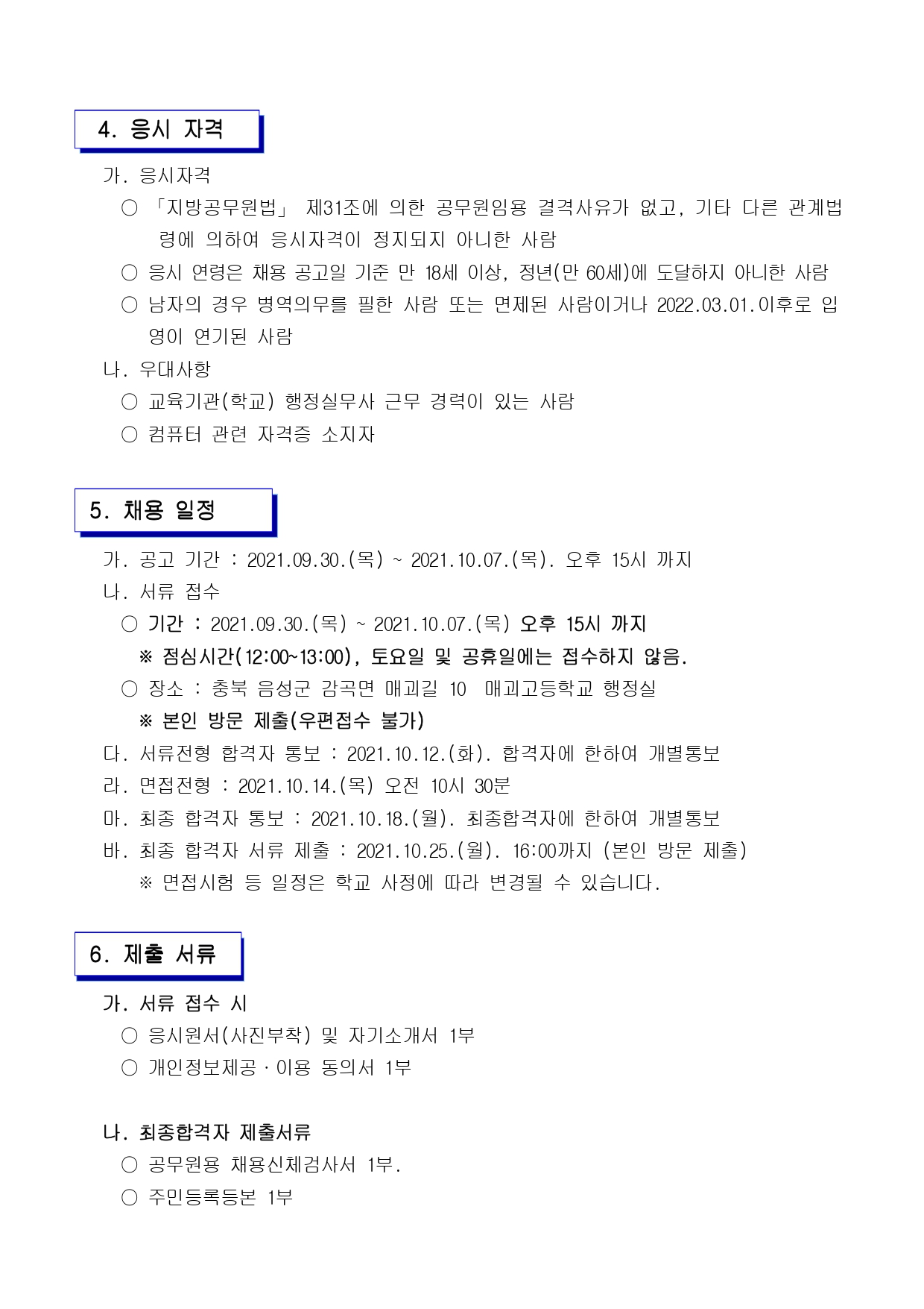 매괴고등학교 교육공무직원(행정실무사) 기간제근로자 채용 공고(9.30~10.7)
