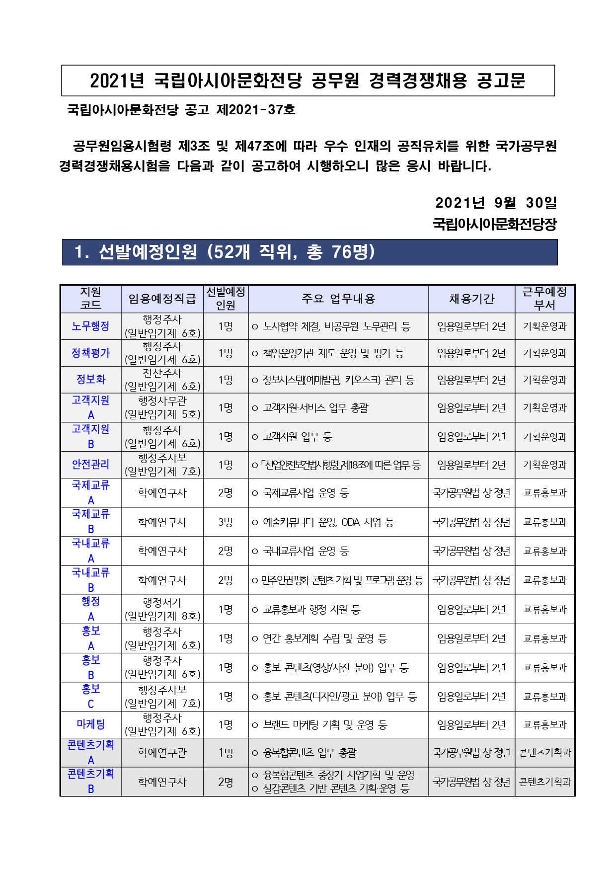 2021년 국립아시아문화전당 공무원 경력경쟁채용 공고문(9.30)