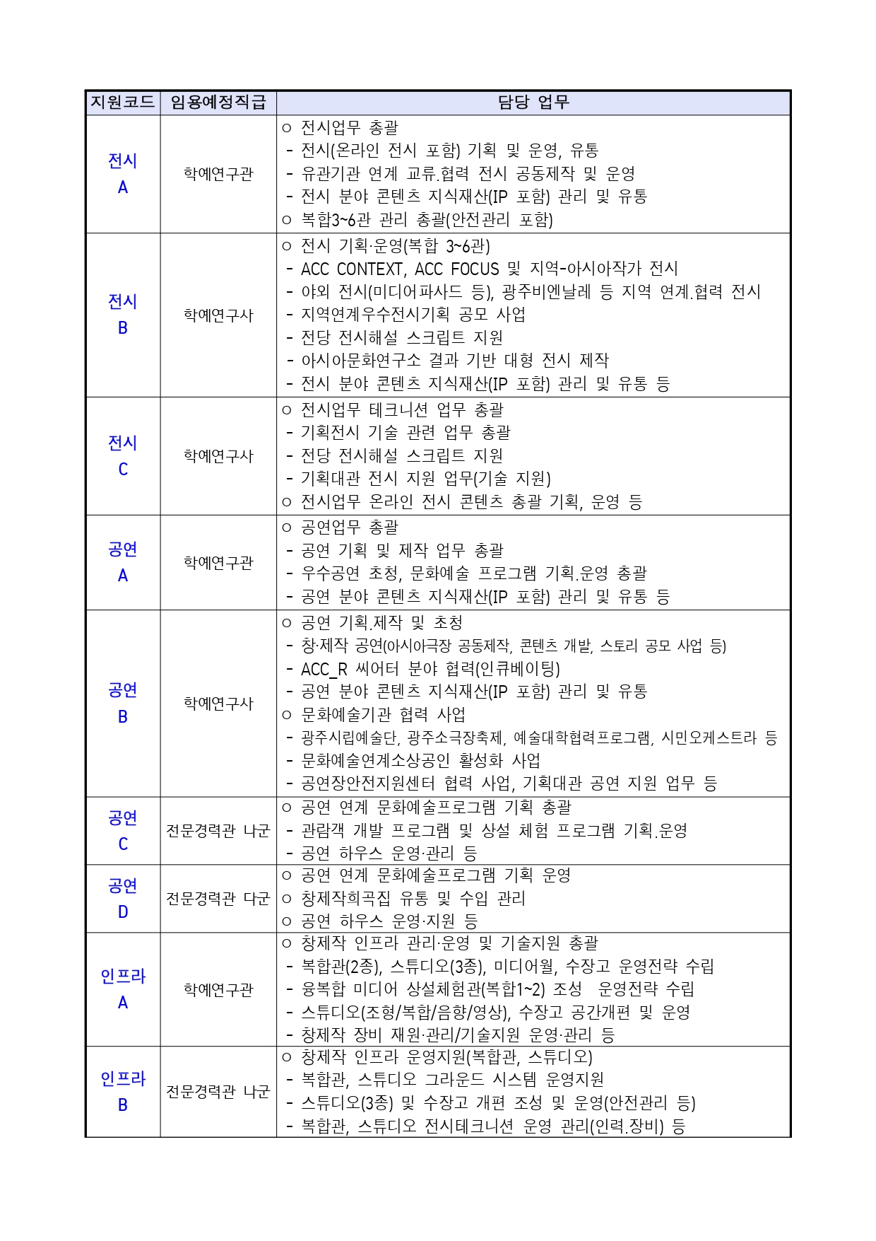 학예연구사 | 2명 | ㅇ 아시아문화자원 수집 중장기 계획 수립 ㅇ 기관 아카이브 이관 기획 및 운영 등 |