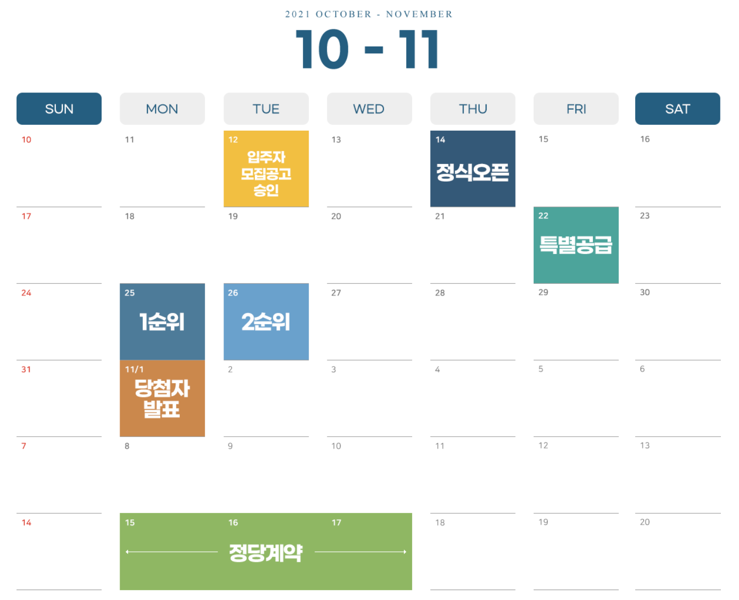 - 본 공동주택의 최초 입주자모집공고일은 2021.10.12.입니다. (청약자격조건의 기간, 나이, 지역우선 등의 청약자격조건 판단기준일입니다.)