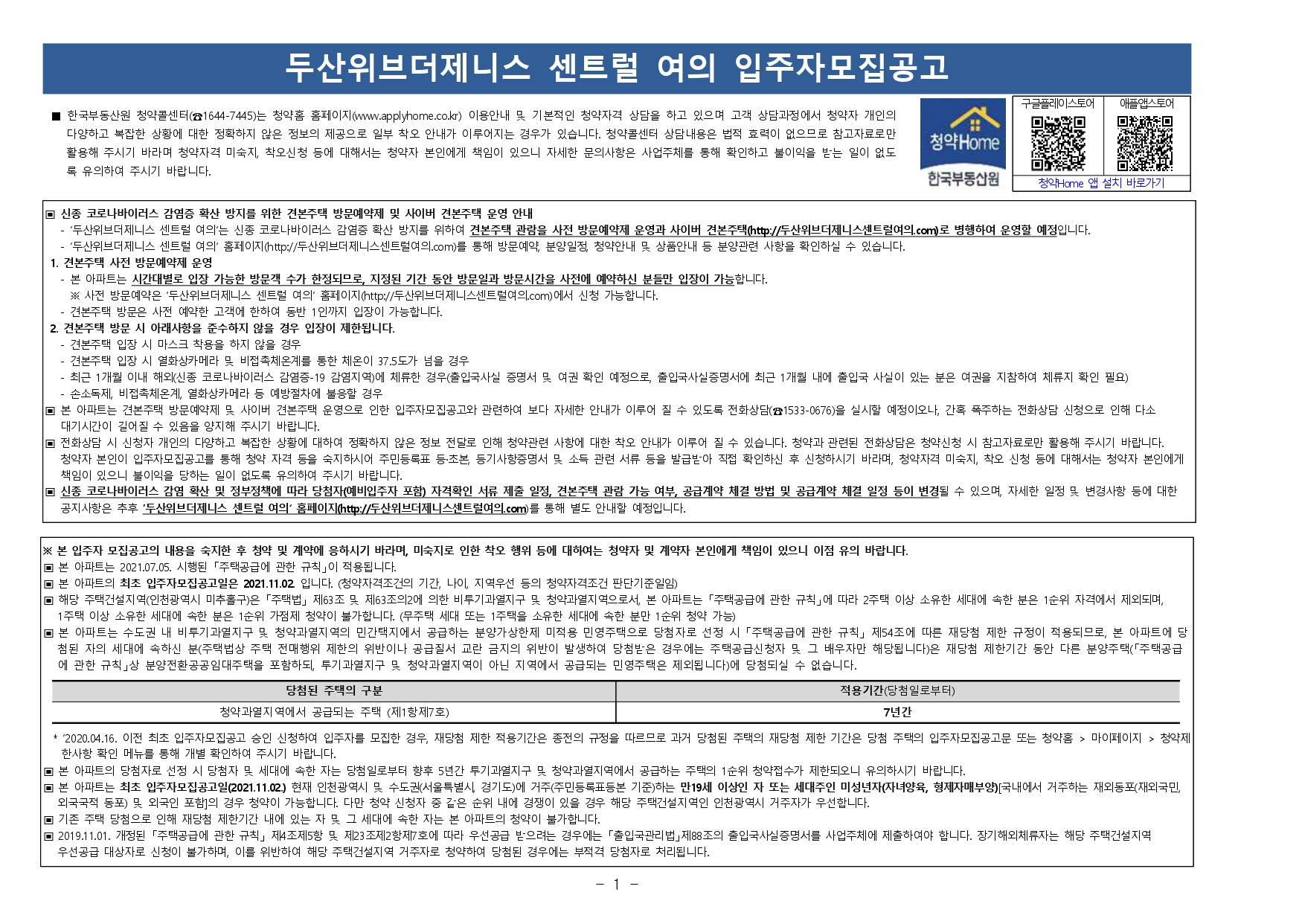 두산위브더제니스 센트럴 여의 입주자 모집공고(2021.112.)입니다.