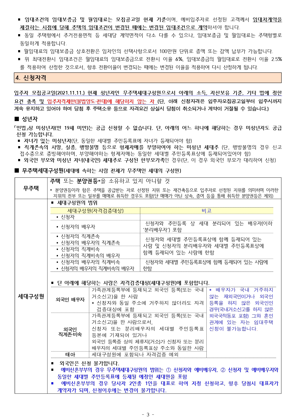 ▪ 이 주택의 예비입주자 모집공고일은 2021.11.11(목)이며, 이는 입주자격과 예비입주자 선정과정에서 경쟁이 있을 때 적용하는 순위 및 배점의 판단 기준일이 됩니다.