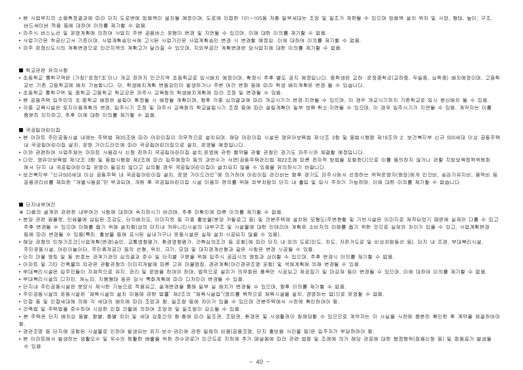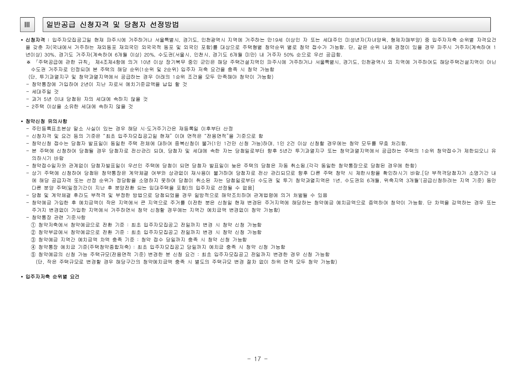 ■ 해당 주택건설지역(경기도 파주시)은 「주택법」 제63조 및 제63조의2에 의한 비투기과열지구 및 청약과열지역으로서, 본 아파트는 「주택공급에 관한 규칙」에 따라 1주택 이상 소유한 세대에 속한 분은 1순위 가점제 청약이 불가하며, 2주택 이상 소유한 세대에 속한 분은 1순위 자격에서 제외됩니다. [1순위 이하(무주택 세대 또는 1주택 소유자)만 1순위 청약이 가능하며, 무주택자(세대주)는 가점세, 1주택 소유한 세 대에 속한자(세대주)는 추첨제로 입주자 선정됩니다.