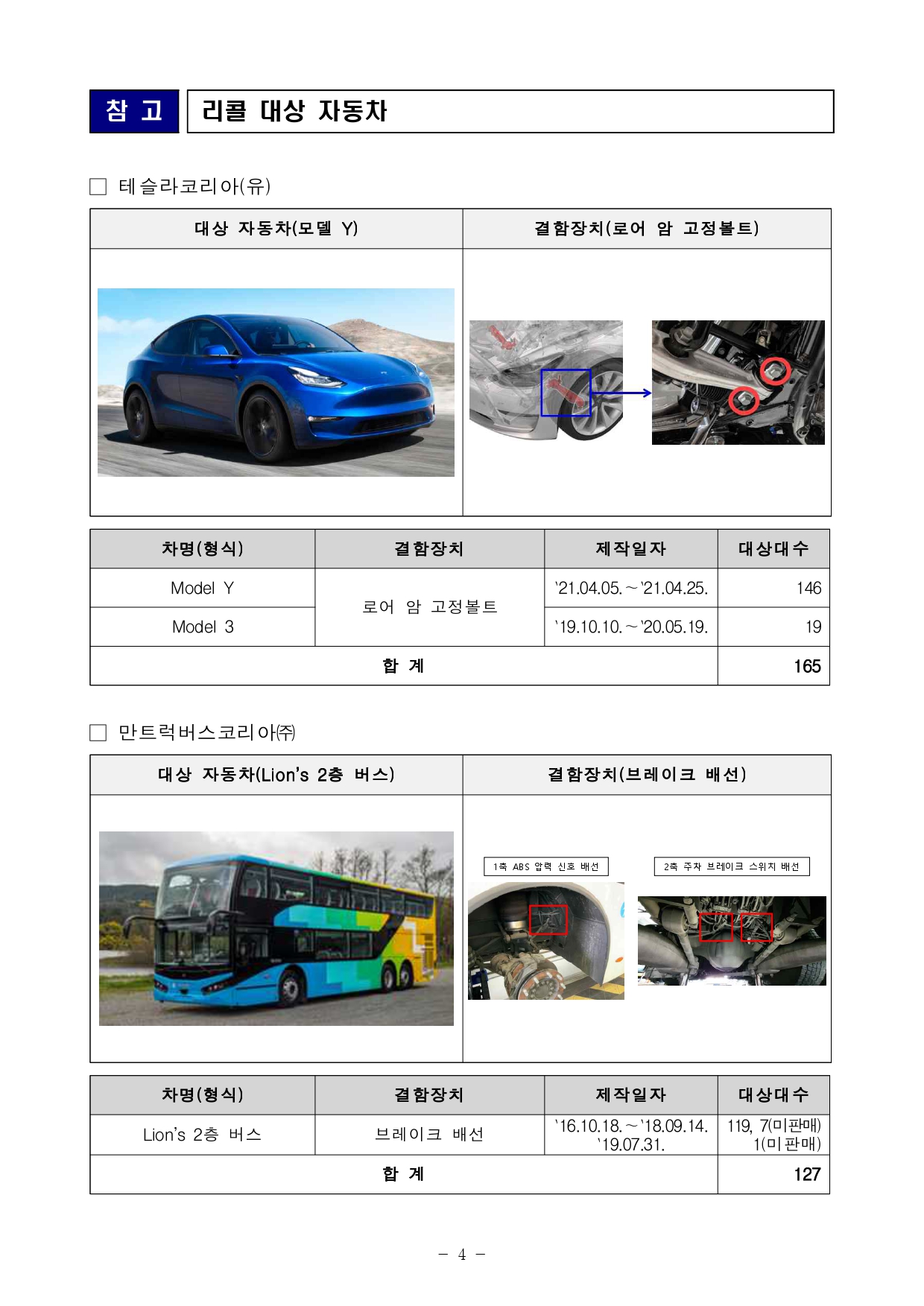 □ 첫째, 테슬라코리아(유)에서 수입, 판매한 모델 Y 등 2개 차종 165대는 앞바퀴 현가장치 내 부품(로어 암)의 고정볼트 체결 불량으로 시간이 지남에 따라 부품이 차체에서 분리되고, 이로 인해 주행 중 조향 등이 제대로 되지 않아 사고가 발생할 가능성이 확인되어 자발적으로 시정조치(리콜)에 들어간다. ㅇ 해당 차량은 11월 19일부터 테슬라코리아(유) 공식 서비스센터에서 무상으로 수리(점검 후 수리 등)를 받을 수 있다.