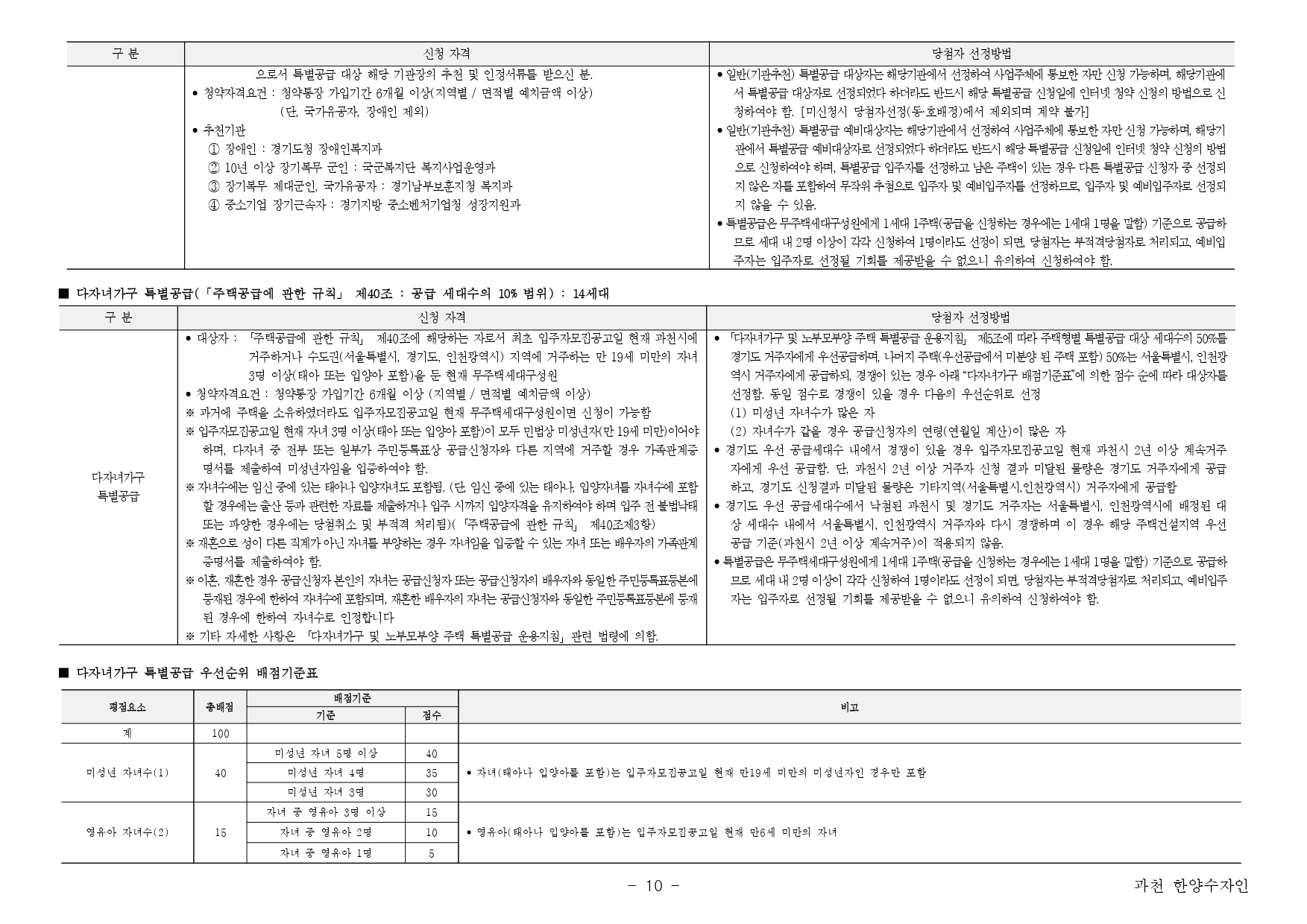 ■ 본 아파트는 투기과열지구에 공급하는 민영주택으로 「주택공급에 관한 규칙」 제28조 규정에 의거 청약접수시 '무주택기간, 부양가족수, 입주자저축 가입기간'을 점수로 계산하여 당첨자를 선정하는 '청약가점제’를 우선적으로 적용하여 입주자를 선정합니다.(전용면적 85㎡이하 주택의 경우 일반공급 세대수의 100%를 가점제로 우선 적용하여 공급합니다.)