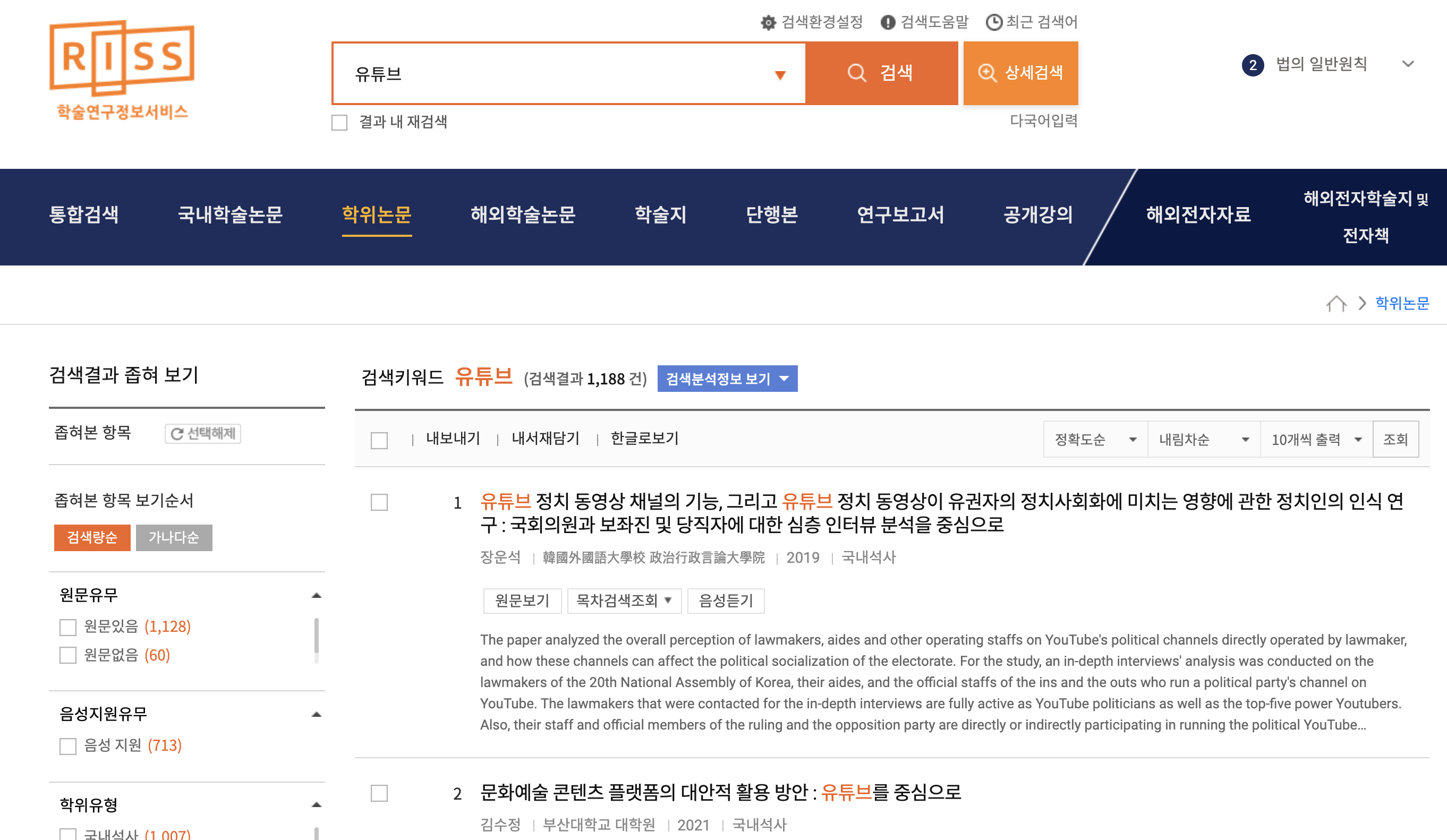 그중에서 RISS 학술연구정보서비스가 학위논문을 검색하기 편리하다.