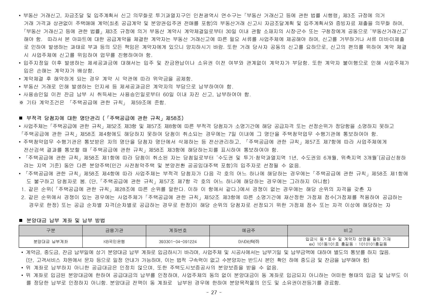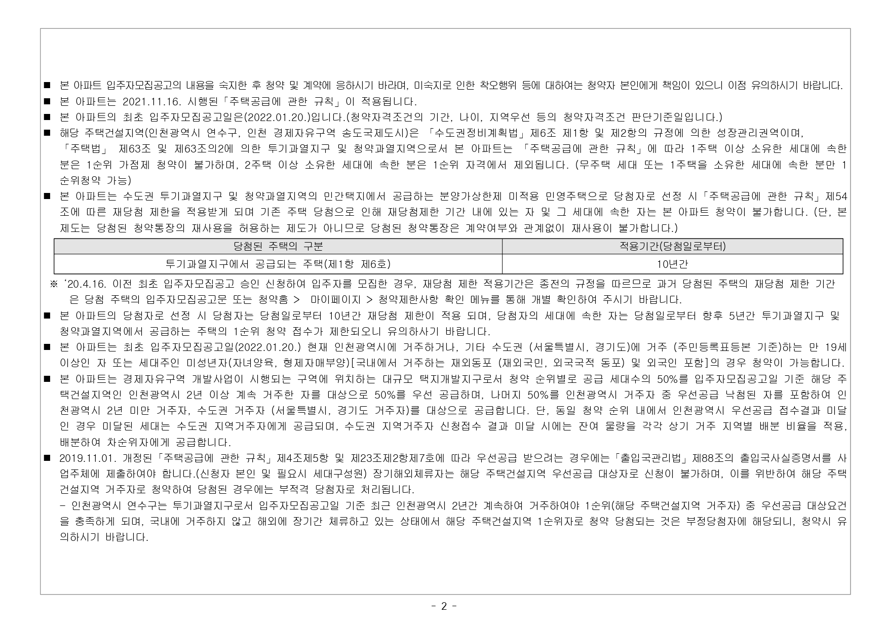 ● 해당 주택건설지역(인천광역시 연수구, 인천 경제자유구역 송도국제도시)은 「수도권정비계획법」제6조 제1항 및 제2항의 규정에 의한 성장관리권역이며, 「주택법」 제63조 및 제63조의2에 의한 투기과열지구 및 청약과열지역으로서 본 아파트는 「주택공급에 관한 규칙」에 따라 1주택 이상 소유한 세대에 속한 분은 1순위 가점제 청약이 불가하며, 2주택 이상 소유한 세대에 속한 분은 1순위 자격에서 제외됩니다. (무주택 세대 또는 1주택을 소유한 세대에 속한 분만 1 순위청약 가능)