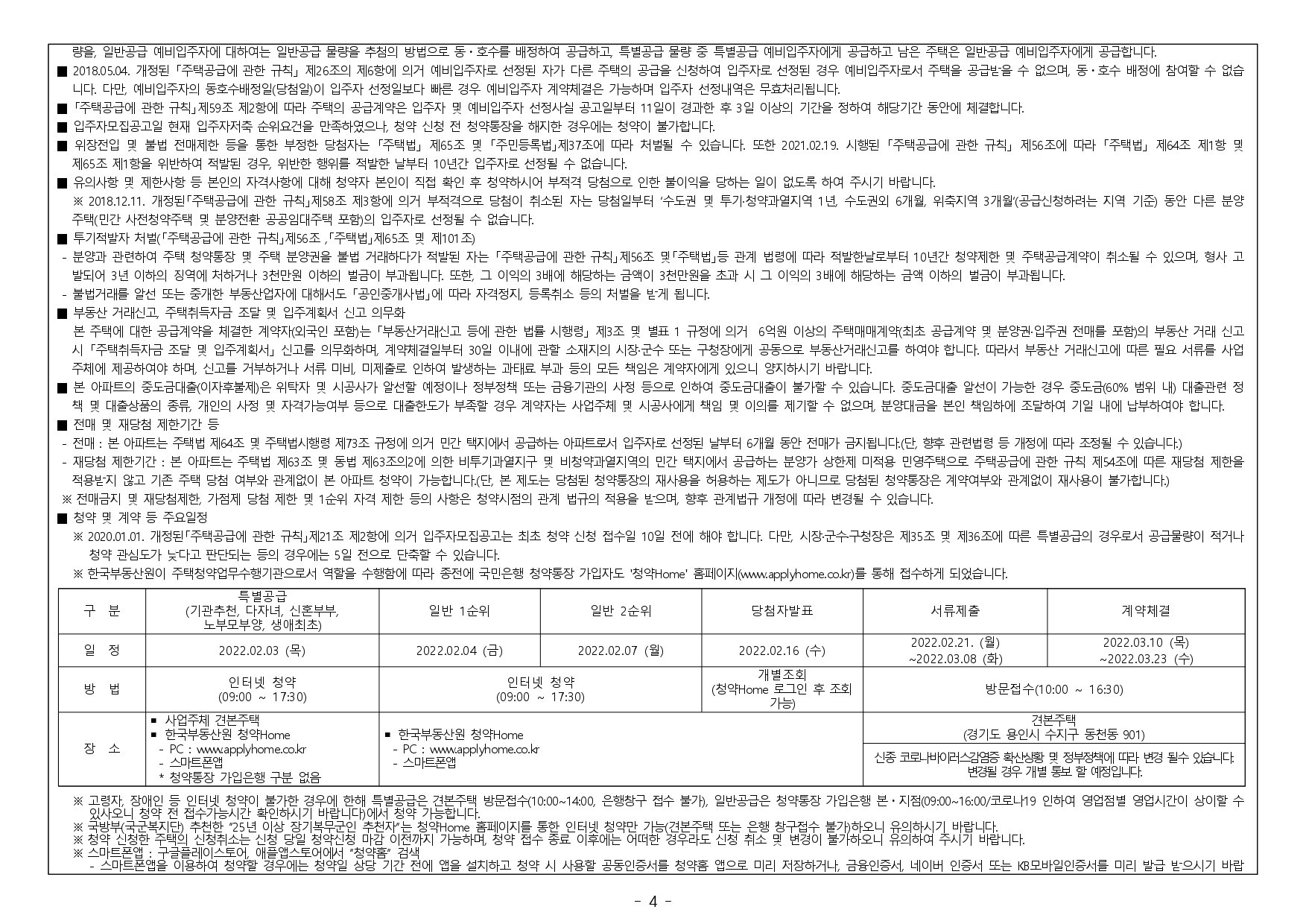 ■ 본 아파트는 최초 입주자모집공고일(2022.01.20) 현재 용인시에 거주하거나 수도권(서울특별시, 인천광역시, 경기도)지역에 거주(주민등록표 등본 기준)하는 만 19세 이상인 자 또는 세대주인 미성년자(자녀양육, 형제자매부양)[국내에서 거주하는 재외동포(재외국민, 외국국적 동포) 및 외국인 포함]의 경우 청약이 가능합니다. 다만 청약 신청자 중 같은 순위 내에 경쟁이 있을 경우 해당 주택건설지역인 용인시 거주자가 우선합니다.
