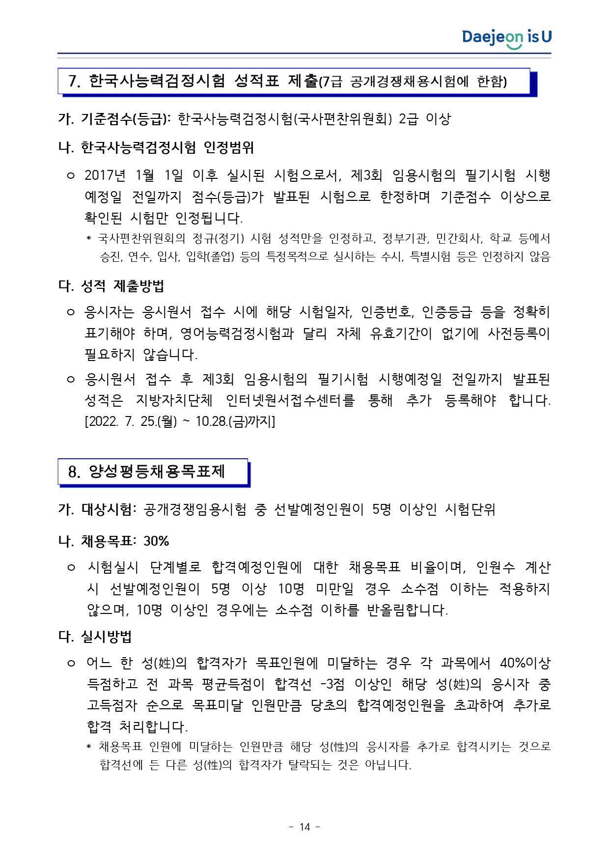 시험채용정보 2022년도 대전광역시 지방공무원 공개(경력)경쟁 임용시험계획 공고 이야기캐는광부 2022. 2. 9. 00:30 반응형 2022년도 대전광역시지방공무원 공개(경력)경쟁 임용시험(제1회, 제2회, 제3회)계획을 다음과 같이 공고합니다. 공무원 시험에 꼭 합격하시길 기원합니다. (공고문) 2022년도 대전광역시 지방공무원 공개(경력)경쟁 임용시험계획 공고★.hwp 1.00MB (공고문) 2022년도 대전광역시 지방공무원 공개(경력)경쟁 임용시험계획 공고★.pdf 3.73MB (붙임 1) 장애유형별(임신부 포함) 응시자 편의지원 안내.hwp 0.12MB (붙임 2) 2022년도 9급 운전직 대형버스 운전경력 증명서.hwp 0.02MB (붙임 3) 2022년도 고졸(예정)자 경력경쟁임용시험 안내.hwp 0.10MB (붙임 4) 연구직렬 관련 학 및 계통학과 학교장 추천서.hwp 0.06MB (붙임 5) 지도직렬 농업계통학과 증명서 및 학교장 추천서(농촌지도직).hwp 0.06MB (붙임 6) 신규임용시험 가산대상 자격증.hwp 0.06MB 반응형 저작자표시 비영리 변경금지 (새창열림)