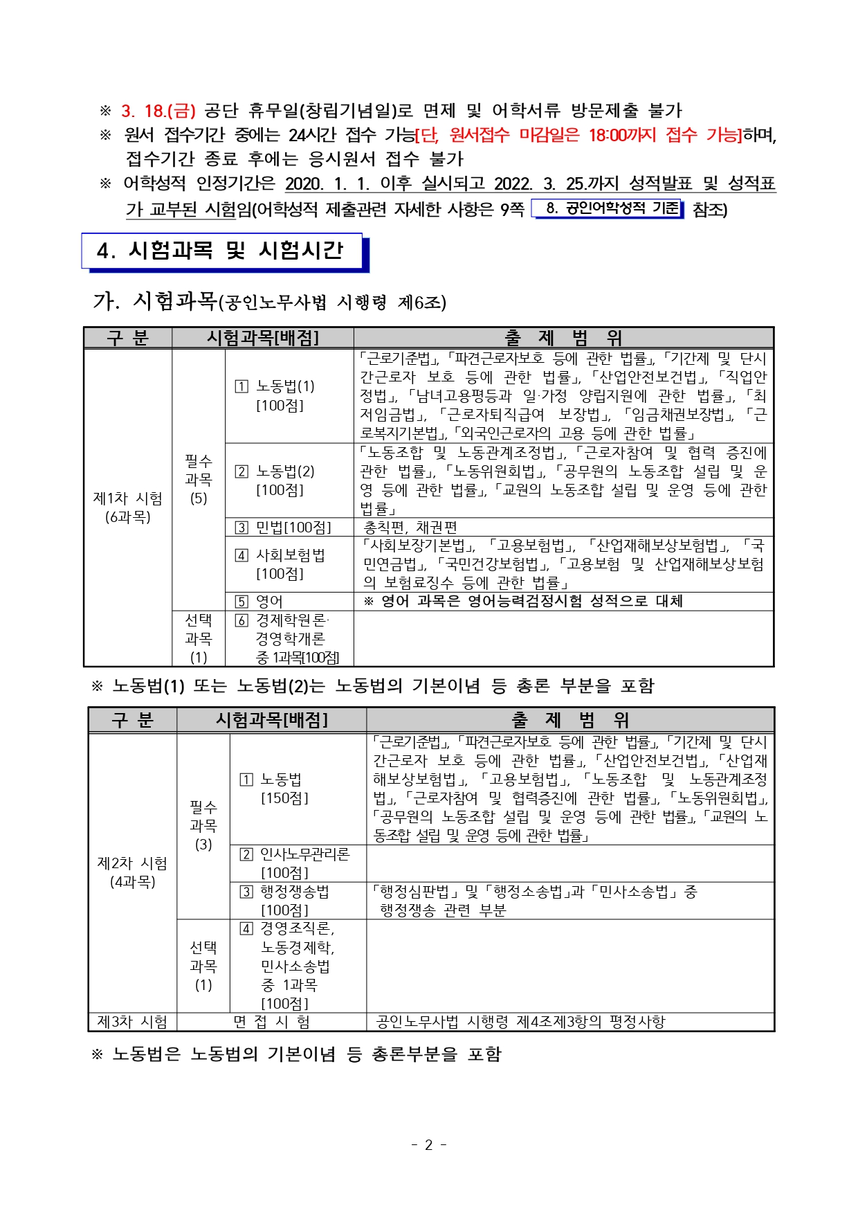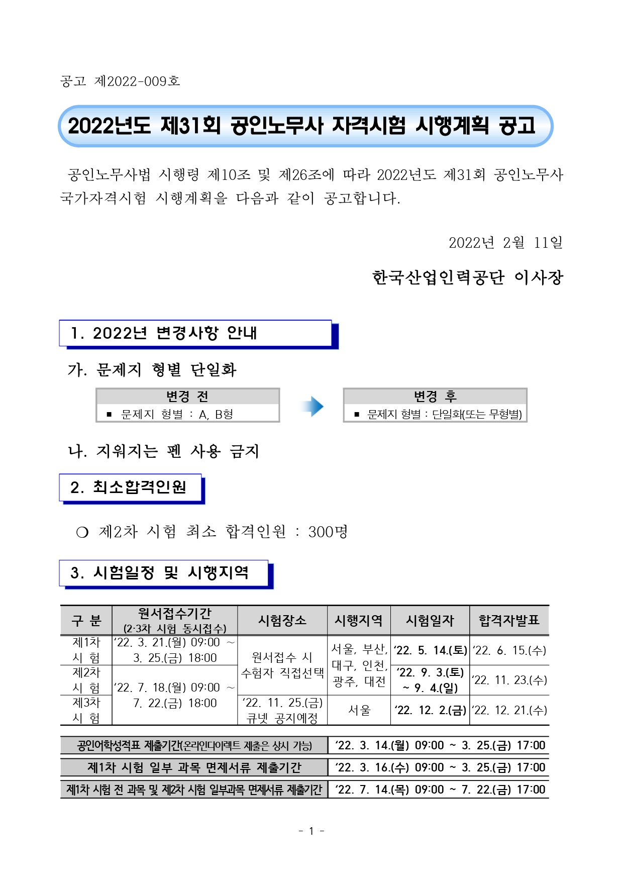 공인노무사법 시행령 제10조 및 제26조에 따라 2022년도 제31회 공인노무사 국가자격시험 시행계획을 다음과 같이 공고합니다.
