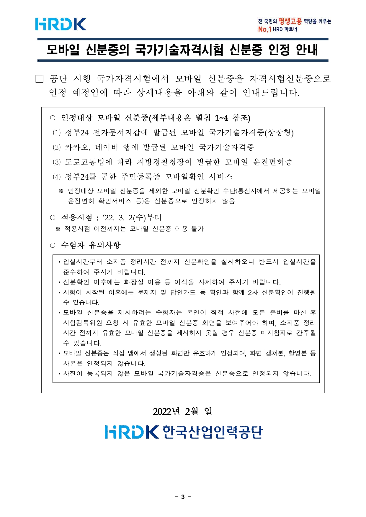2022년 기사 제1회 필기시험(기사·서비스, 산업기사) 수험자 안내