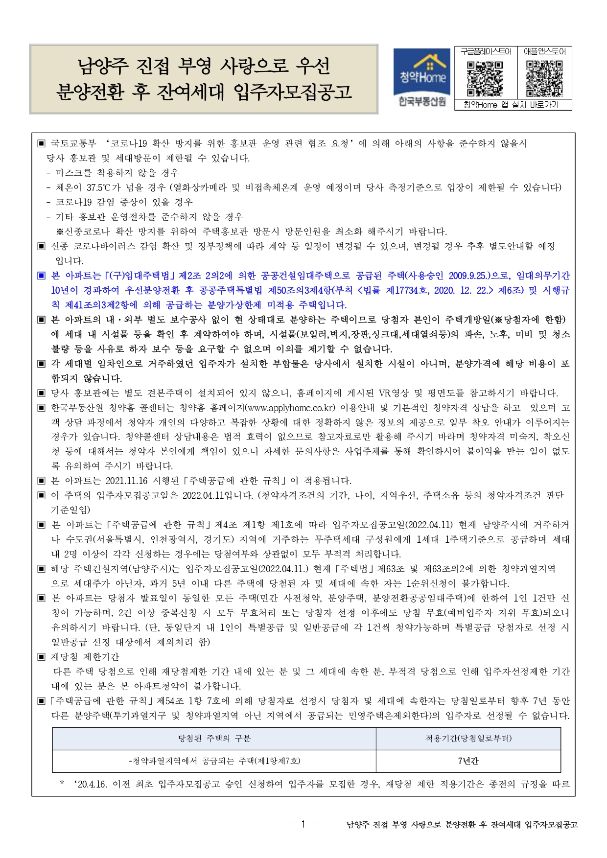 남양주 진접 부영 사랑으로 우선 분양전환후 잔여세대 입주자 모집공고입니다.