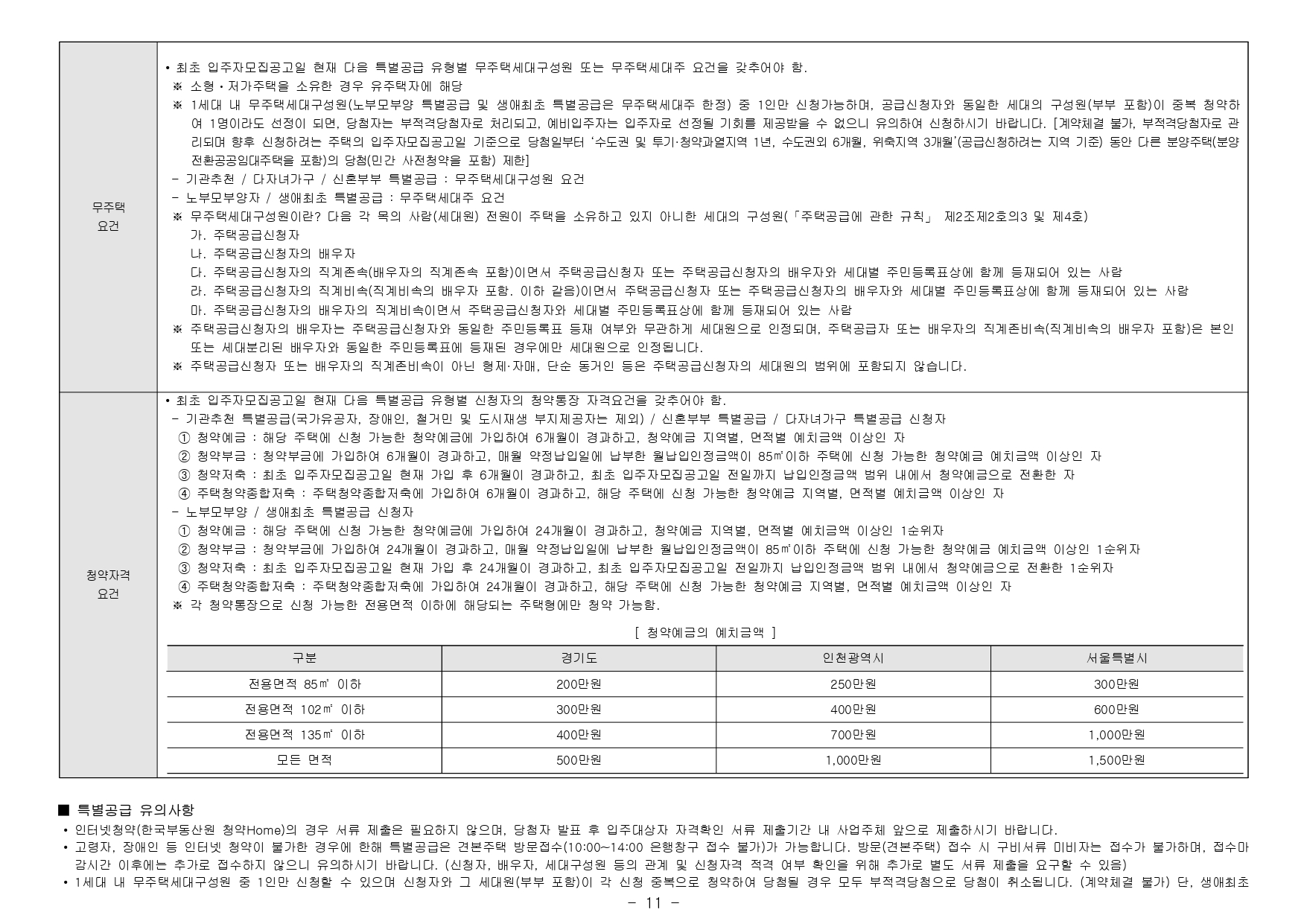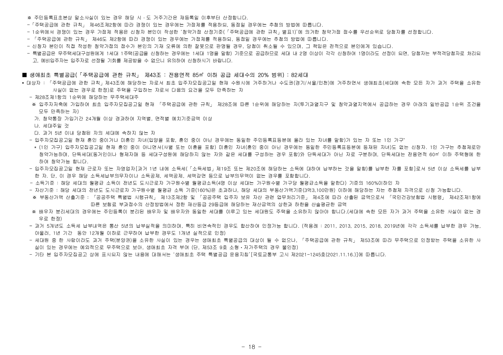 - 본 아파트는 당첨자 발표일이 동일한 모든 주택(민간 사전청약, 분양주택, 분양전환공공임대주택)에 한하여 1인 1건만 신청이 가능하며, 2건 이상 중복신청 시 모두 무효처리 또는 당첨자 선정 이후에도 당첨 무효(예비입주자 지위 무효)되오니 유의하시기 바랍니다. (단, 동일단지 내 1인이 특별공급 및 일반공급에 각 1건씩 청약가능하며 특별공급 당첨자로 선정 시 일반공급 선정 대상에서 제외처리 함)