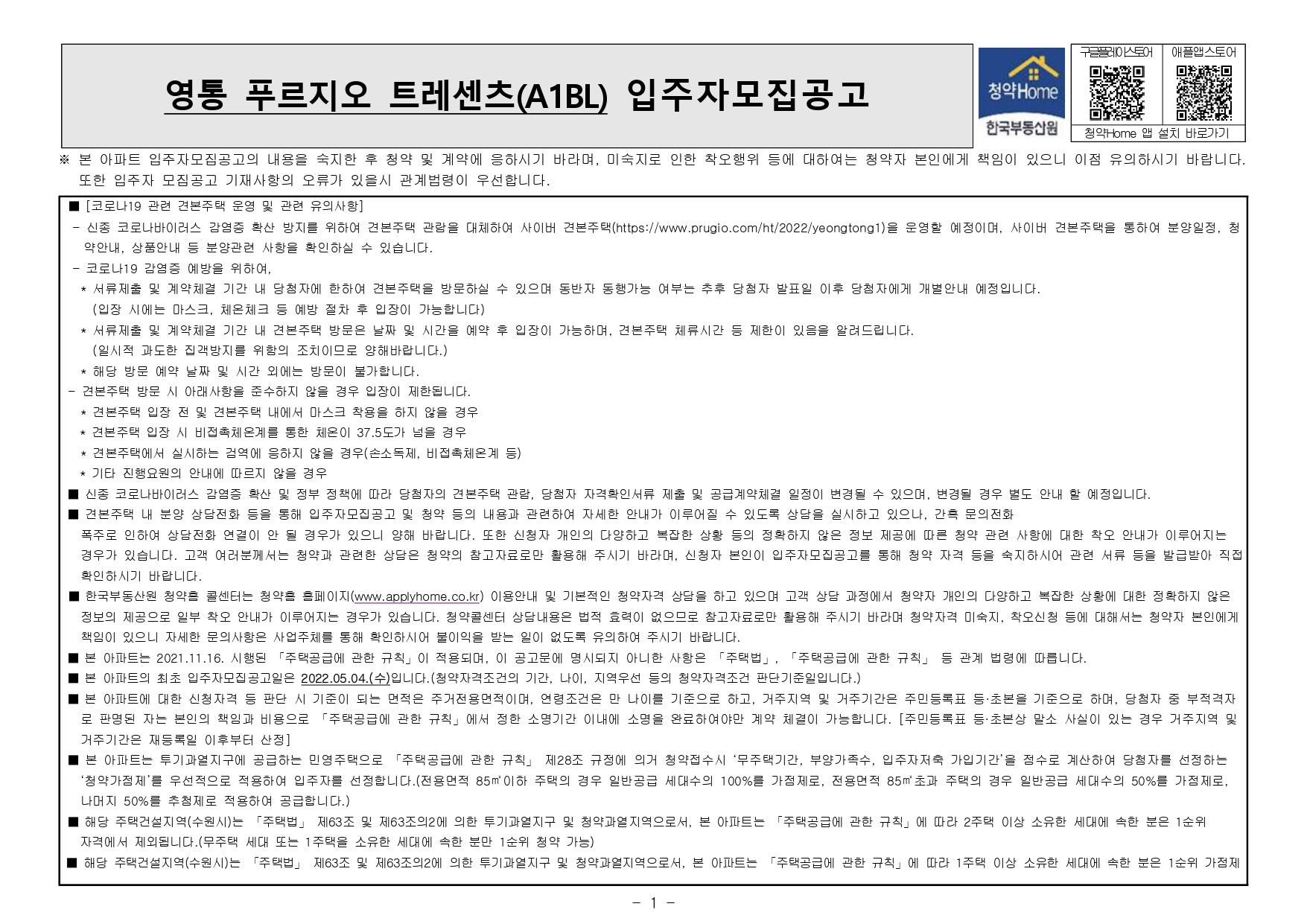 영통 푸르지오 트레센츠(A1BL) 입주자모집공고
