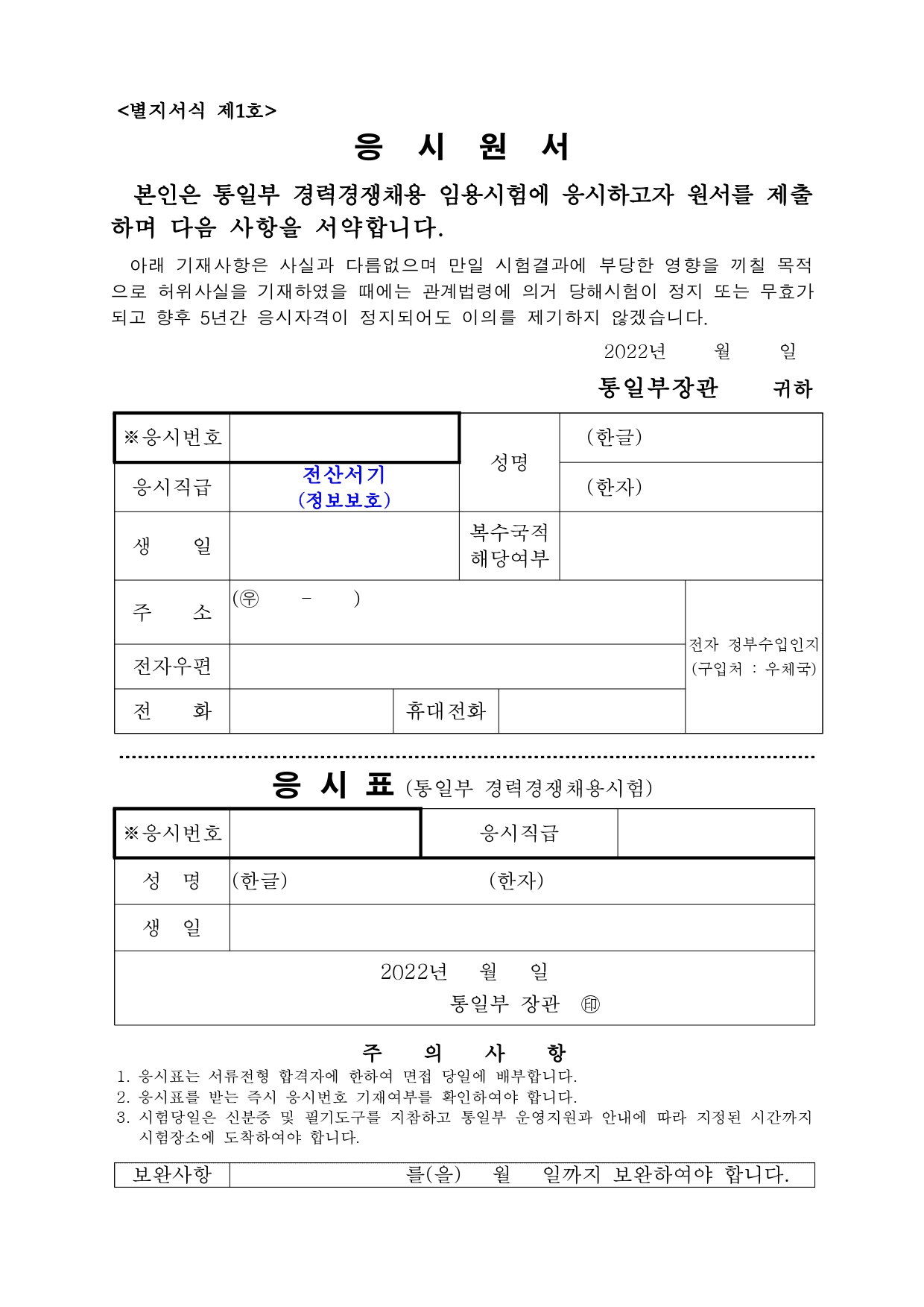 통일부에서는 다음과 같이 전산직(8급 1명) 공무원 경력경쟁채용시험을실시하오니 유능한 인재의 많은 응모를 바랍니다.