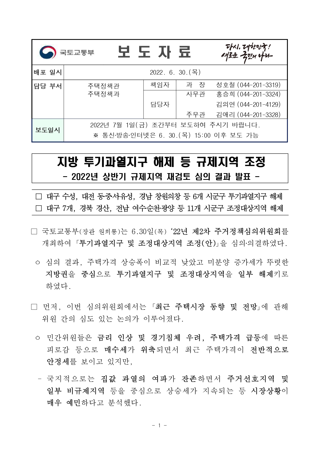 국토교통부 보도자료 <2022년 지방 투기과열지구 해제 등 규제지역 조정 안내>