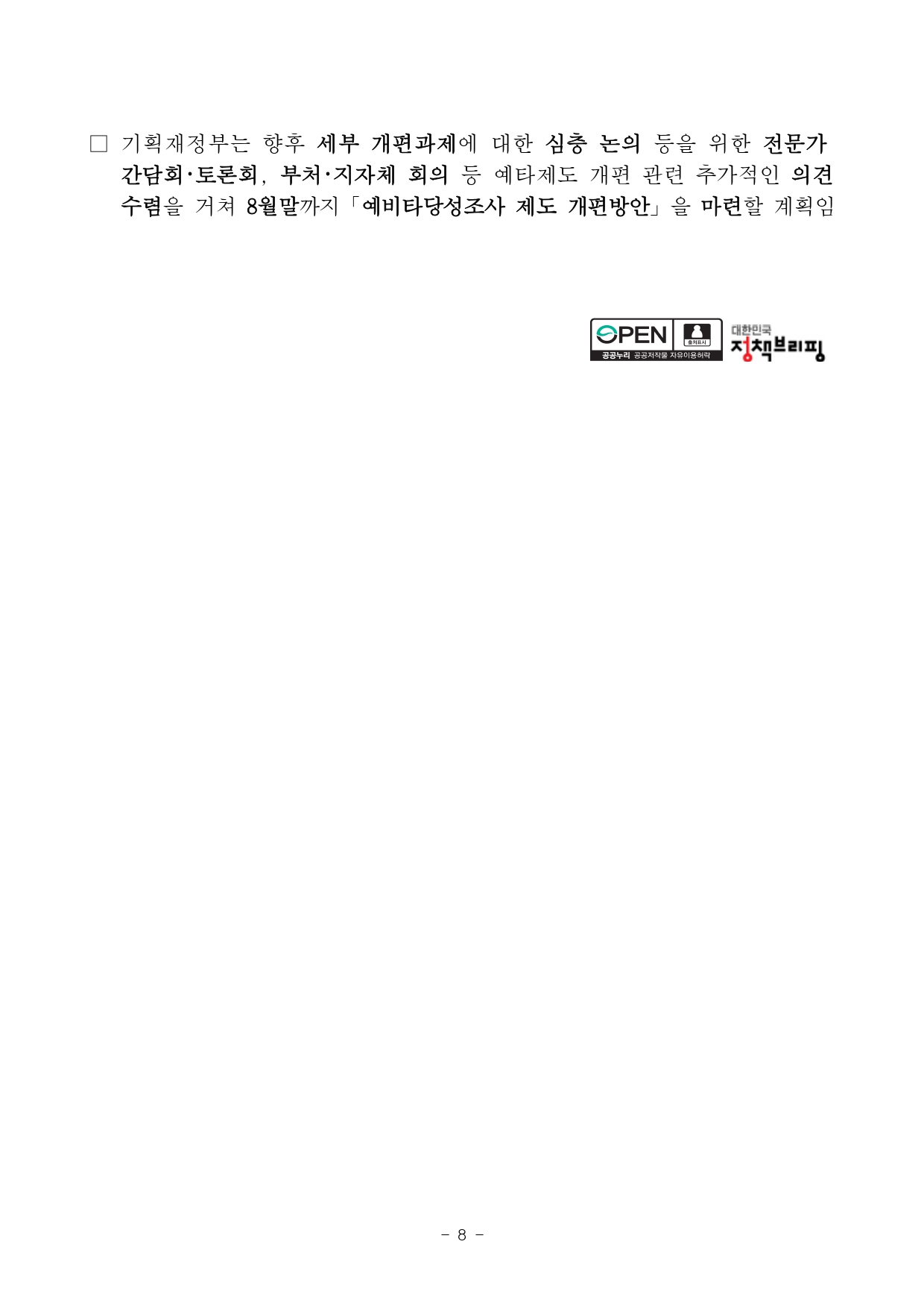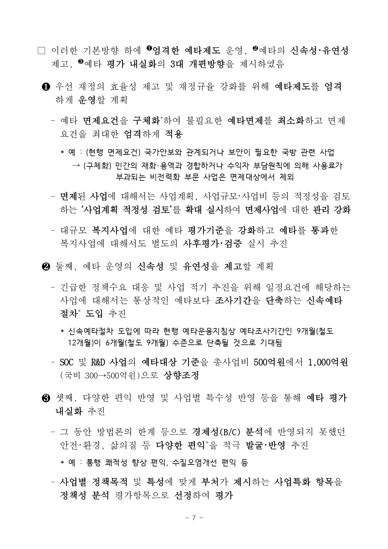□ 예타 면제요건 구체화, 신속예타절차 도입, SOC・R&D사업 예타대상 기준 상향조정(500→1,000억원) 등 종합적인 예타제도 개편방향 논의