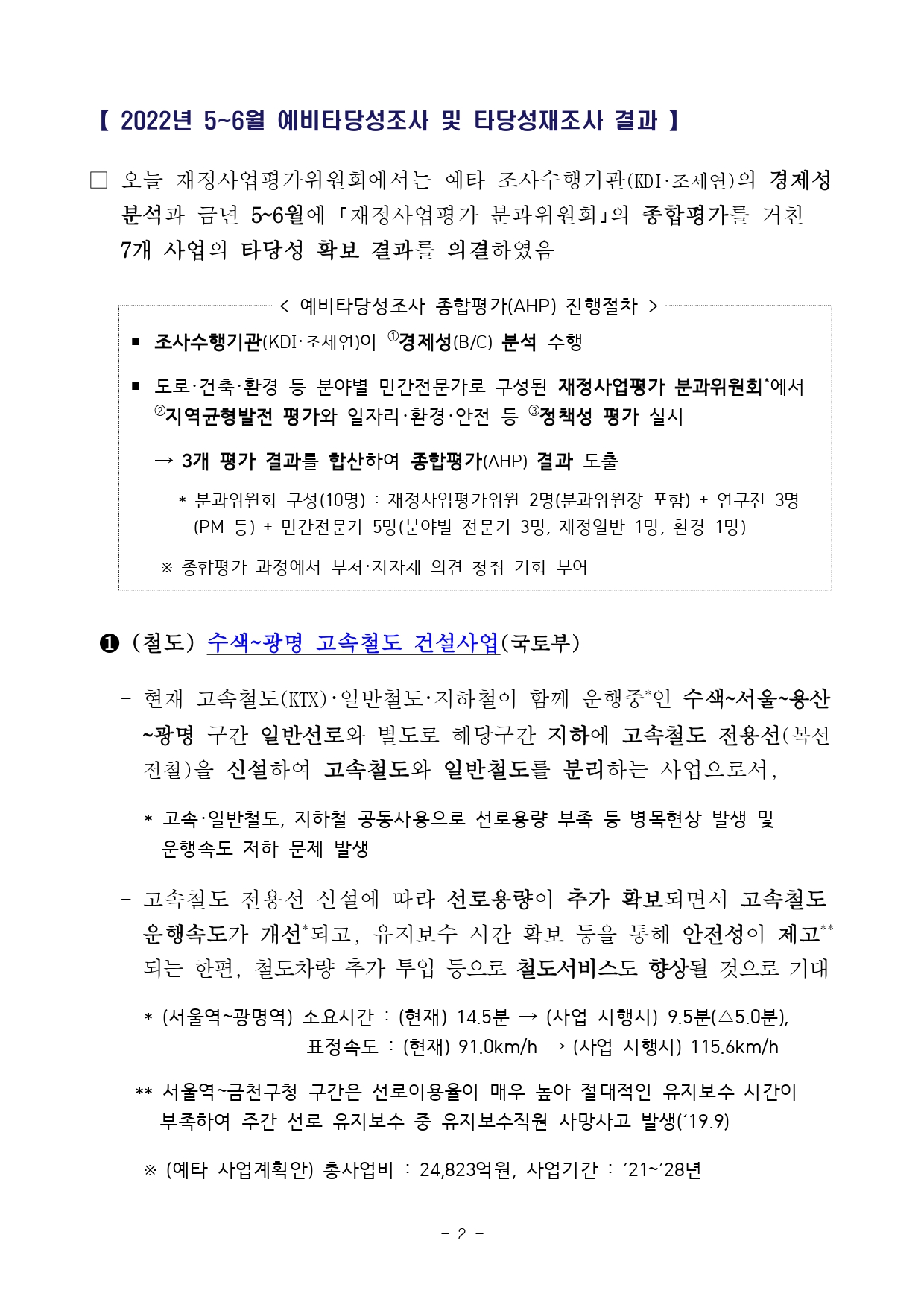 수색~광명 고속철도 건설 등 4개 사업 예타 통과 예비타당성조사 제도 개편방향 논의에 관한 보도자료입니다.