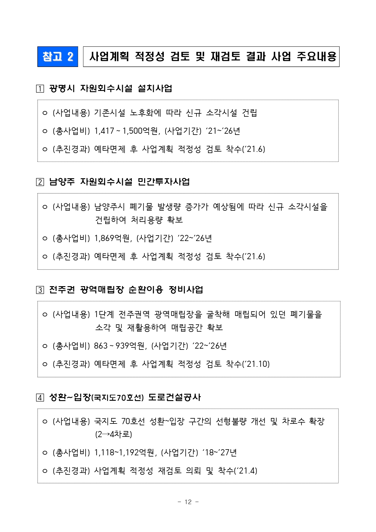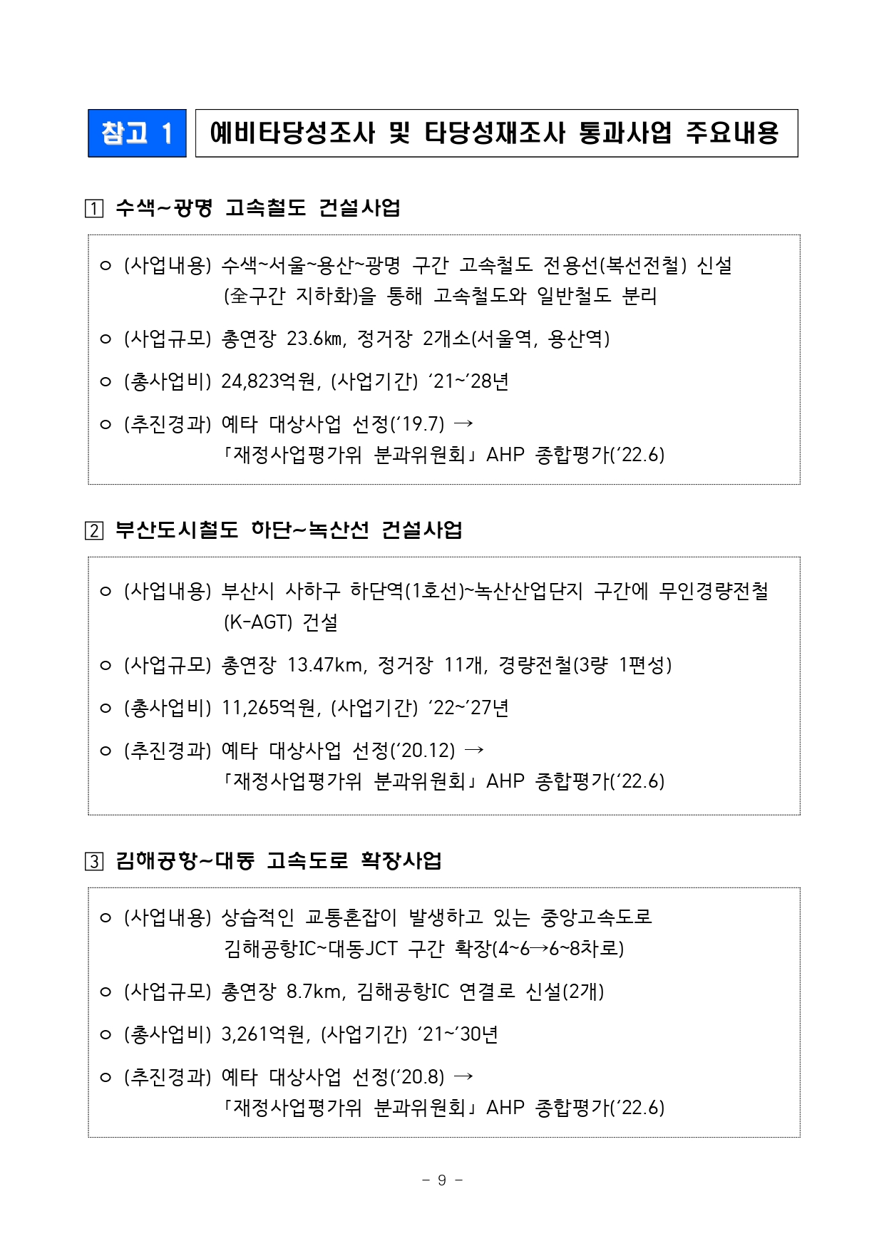 □ 수색~광명 고속철도 건설사업, 부산도시철도 하단~녹산선 건설, 낙동강 유역 안전한 먹는 물 공급체계 구축 등 4개 사업 예타 통과