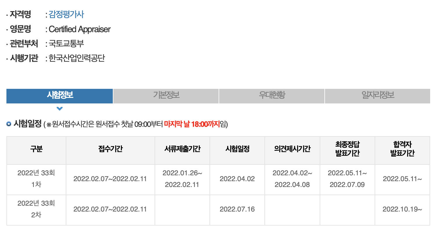 한국산업인력공단 홈페이지에 기재된 시험일정과 시험정보, 시험과목 등을 살펴보면 다음과 같습니다.