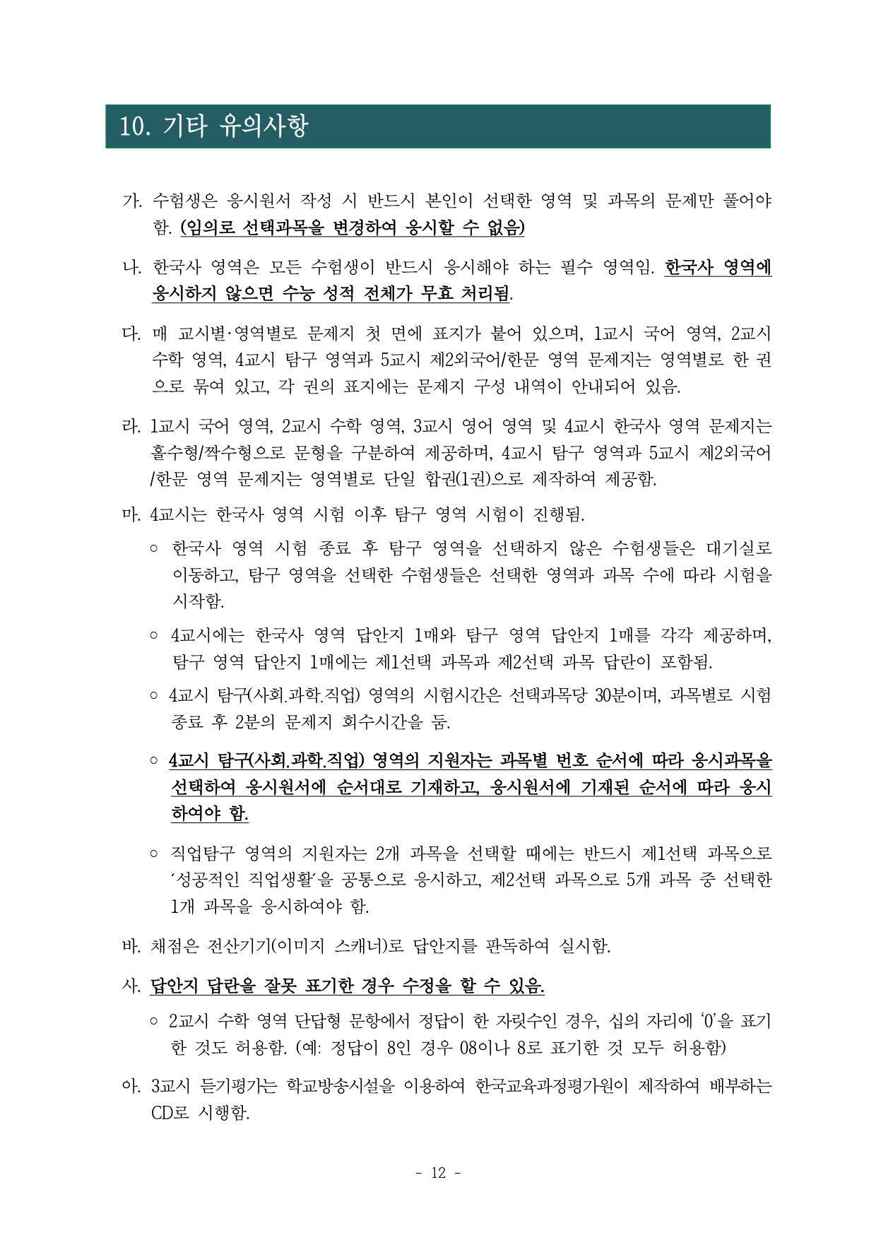 아울러, 2022학년도 수능부터 도입된 시험 체제에 따라 국어‧수학‧직업탐구 영역은‘공통과목+선택과목’구조가 적용되고, 사회・과학탐구 영역은 사회‧과학 구분 없이 17개 선택과목 중에서 최대 2개 과목 선택이 가능하다. 올해에도 작년과 같이 영어와 한국사, 제2외국어/한문 영역은 절대평가로 치러지며, 한국사/탐구 영역 시험에서는 수험생에게 한국사와 탐구 영역 답안지를 분리하여 별도 제공한다.