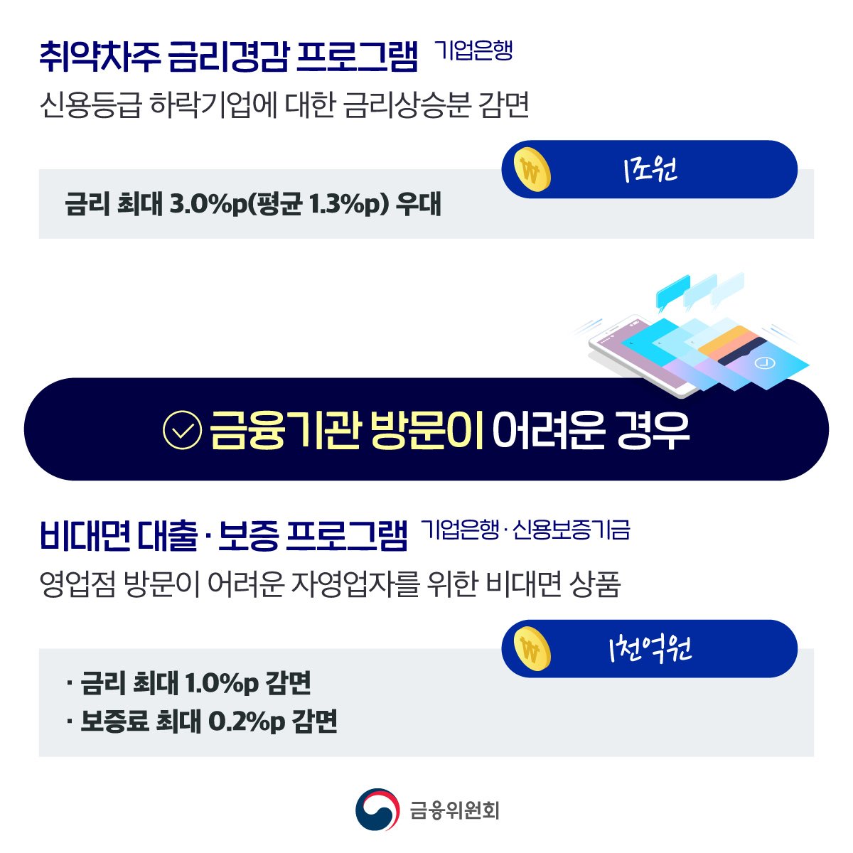 금융위원회가 자영업자 및 소상공인의 상황별 맞춤형 금융지원 프로그램을 마련했습니다.