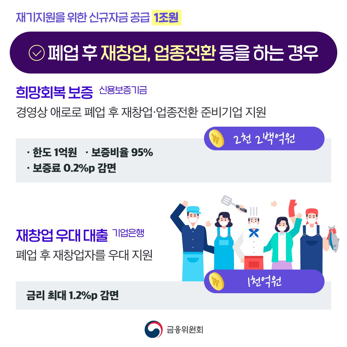 ✅ 폐업 후 재창업을 준비하는 등 재기지원을 위해 노력하고 있는 자영업자·소상공인을 위한 신규자금 공급 1조원