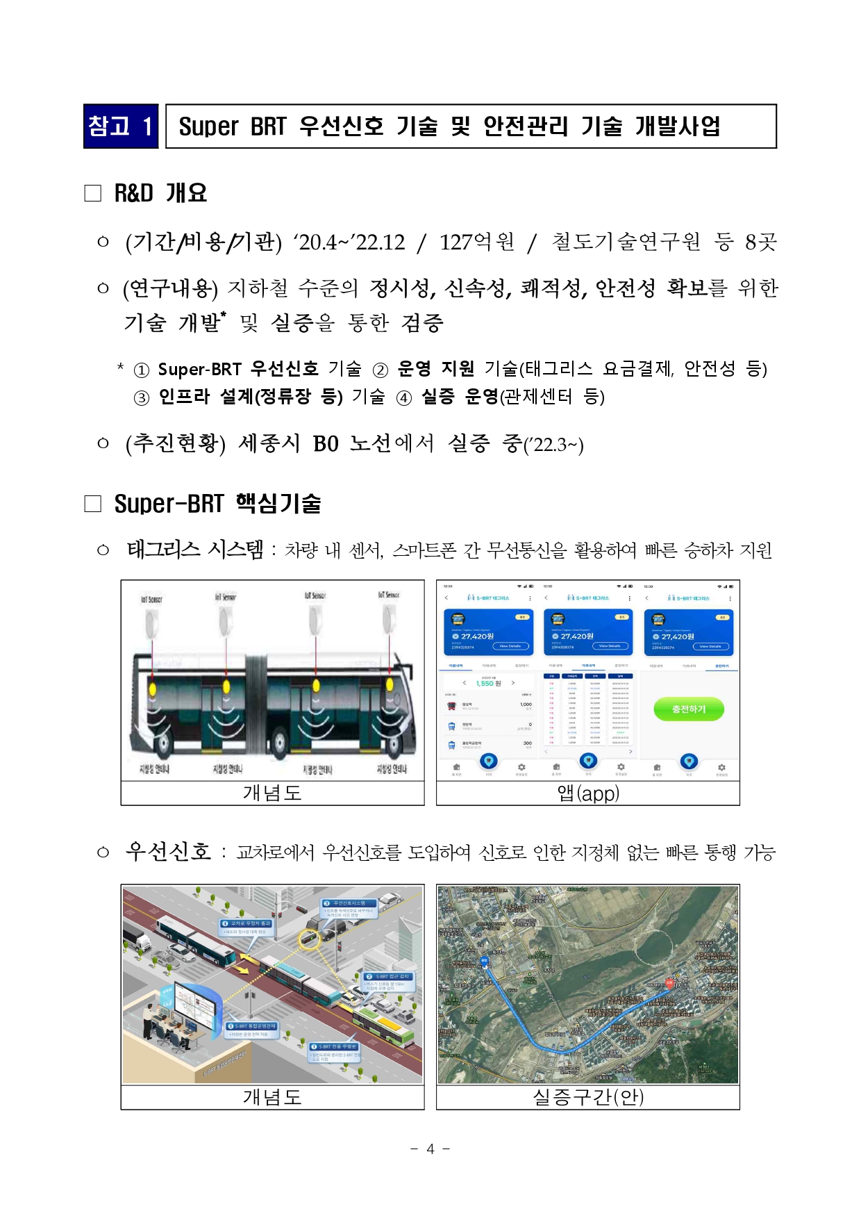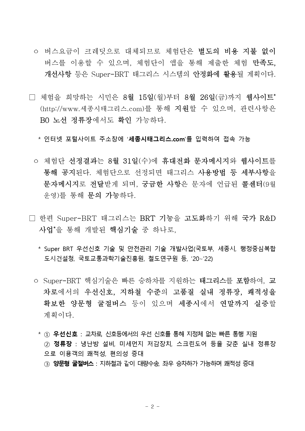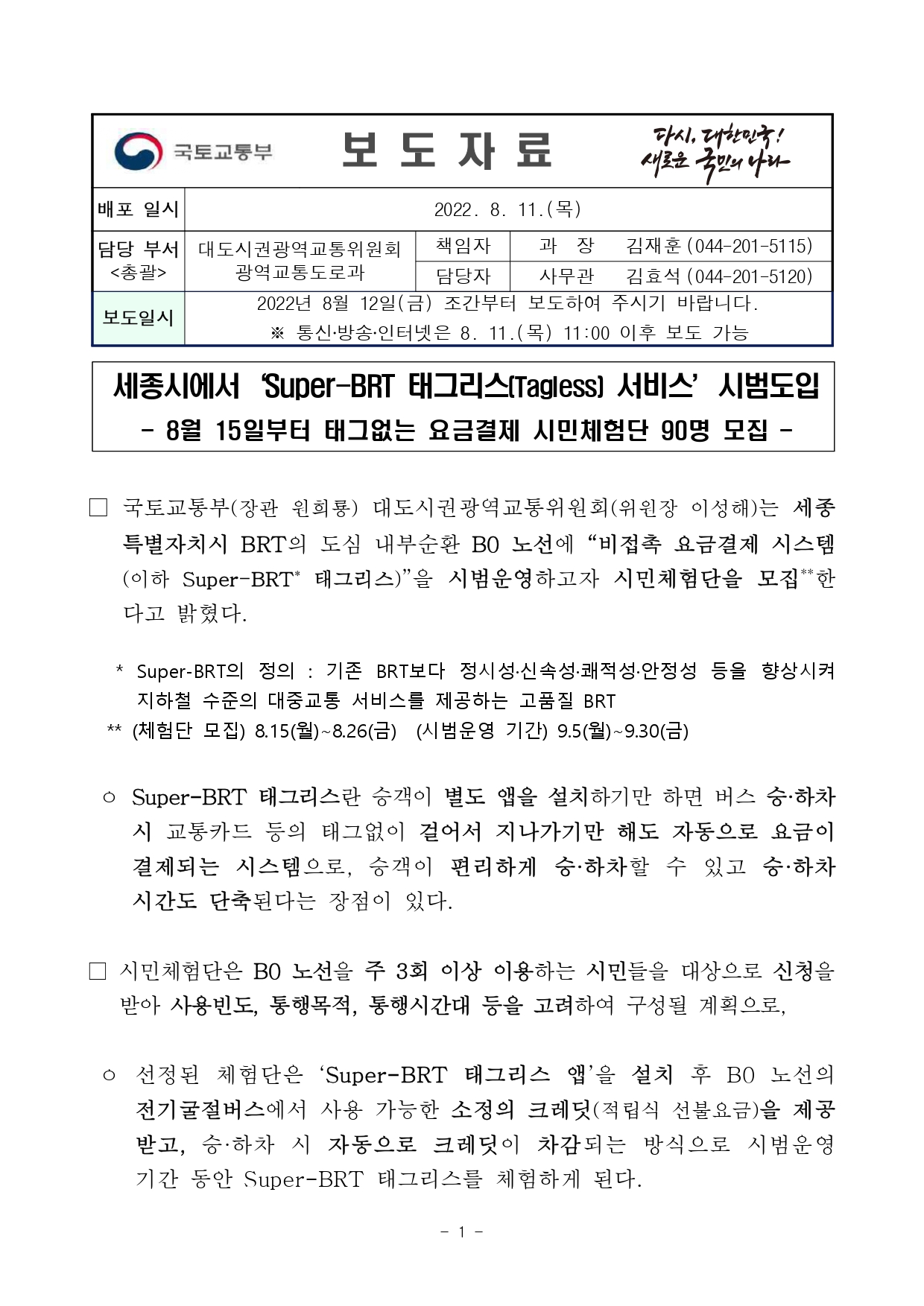 국토교통부(장관 원희룡) 대도시권광역교통위원회(위원장 이성해)가 세종 특별자치시 BRT의 도심 내부순환 B0 노선에 “비접촉 요금결제 시스템 (이하 Super-BRT* 태그리스)”을 시범운영한다.