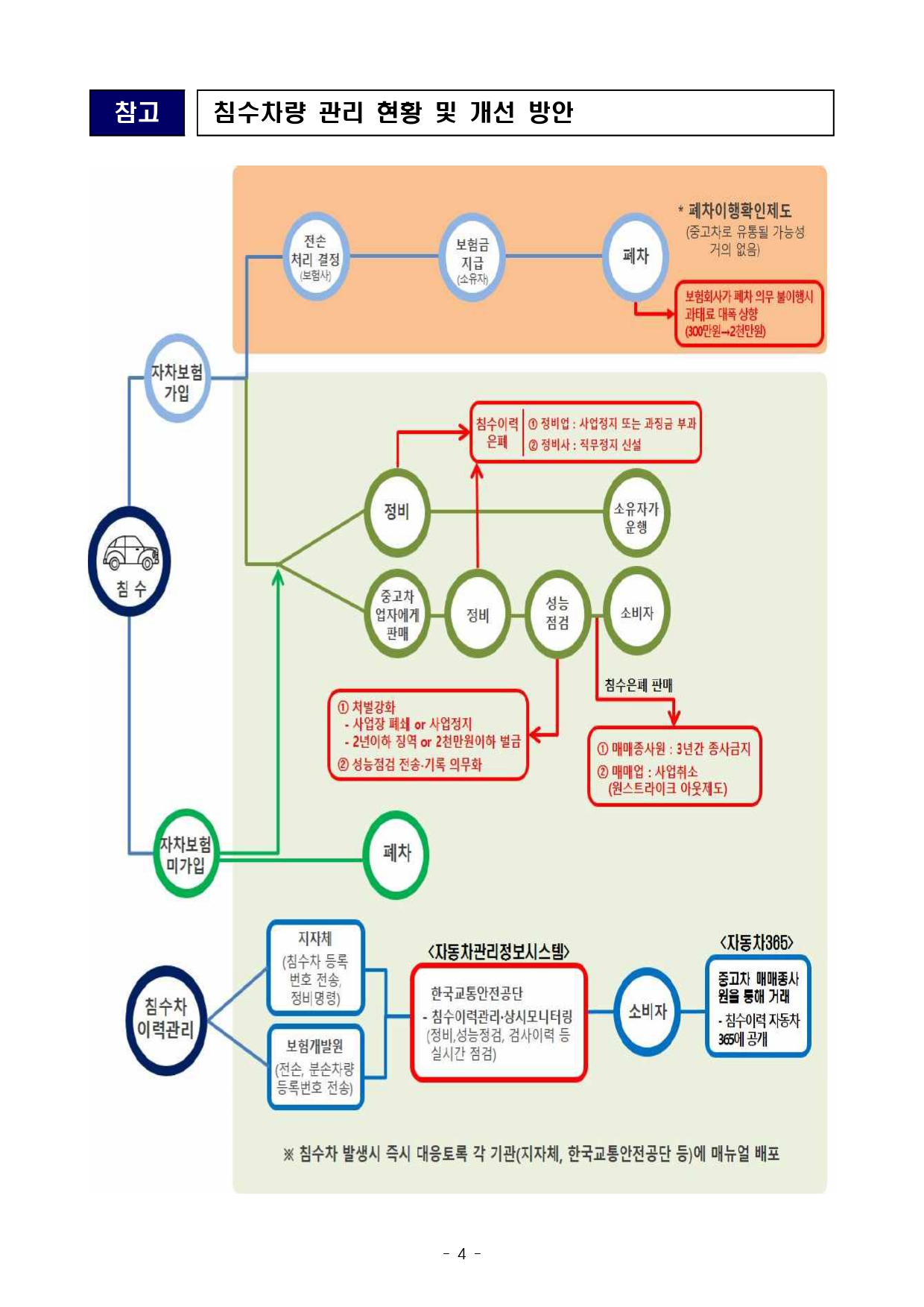 특히 115년 만의 최대 폭우로 침수차 불법유통에 대한 국민들의 불안감이 그 어느 때보다 크기 때문에, 정부는 보험개발원, 자동차매매연합회, 자동차 전문가 의견을 수렴하여 침수 이력관리체계 전면 보강, 침수 사실 은폐에 대한 처벌 강화, 침수차 사후 추적 적발체계 구축, 침수기준 및 가이드 라인 마련 등 침수차 관리를 대폭 강화하기로 하였다.